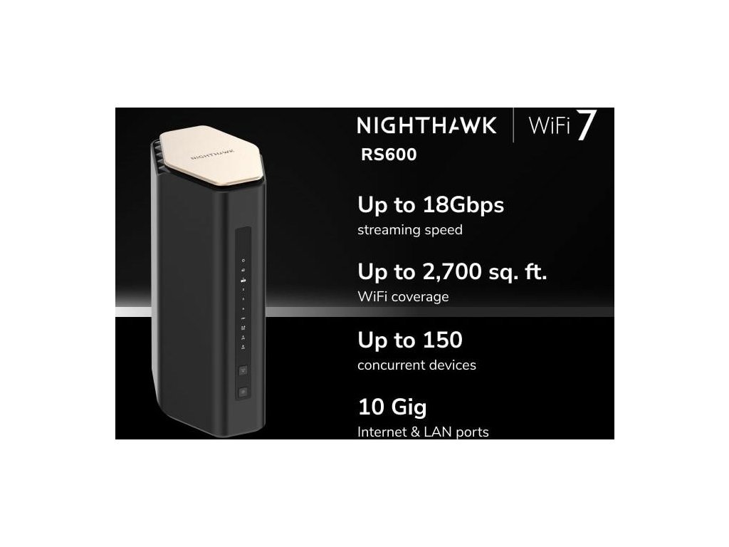 WiFi 7 od lídra v oblasti inovací WiFi - Nighthawk WiFi 7 je postaven na více než 25 letech průkopnických inovací a precizně navržen podle přísných standardů kvality společnosti NETGEAR, takže můžete využívat všech výhod, které WiFi 7 nabízí. Bleskově rychlá WiFi -Bleskově rychlá WiFi 7 s rychlostí až 18 Gb/s pro hraní her, plynulé streamování, videokonference a zábavu. Větší kapacita pro datově náročné činnosti - Připojte až 150 zařízení, jako jsou bezpečnostní kamery, chytrá domácí zařízení a reproduktory, a užívejte si streamování videa v rozlišení 4K/8K, online hraní a videokonference. Vícegigové rychlosti s internetovým portem 10GbE- Využijte 10gigový internetový port pro kabelové a optické připojení s rychlostí až 10 Gb/s. Kompatibilní s jakýmkoli poskytovatelem internetových služeb.- Kabelový port 10GbE a další- Připojte kabelová zařízení a zvyšte výkon prostřednictvím portu 10Gb/s Ethernet LAN a tří portů 1Gb/s Ethernet LAN.