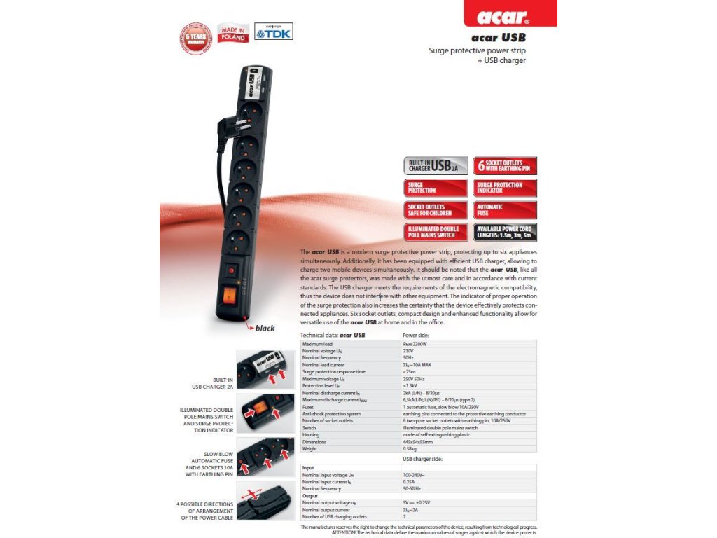 Nabíječka USB splňuje veškeré požadavky elektromagnetické kompatibility, takže zařízení neovlivňuje žádná jiná zařízení v okolí. Indikátor správné funkce přepěťové ochrany také zvyšuje jistotu, že zařízení efektivně chrání připojené spotřebiče. Šest zásuvek, kompaktní design a vylepšená funkčnost umožňují univerzální použití Acar USB pro doma i v kanceláři.