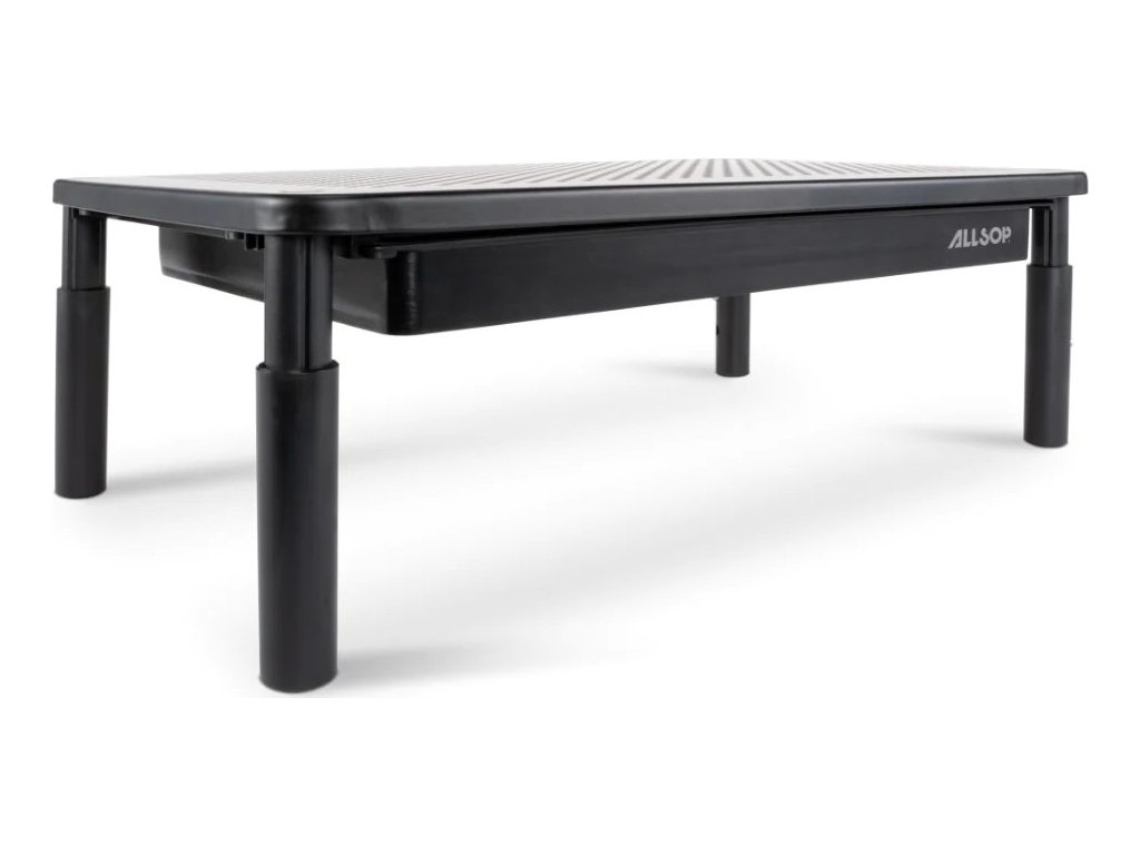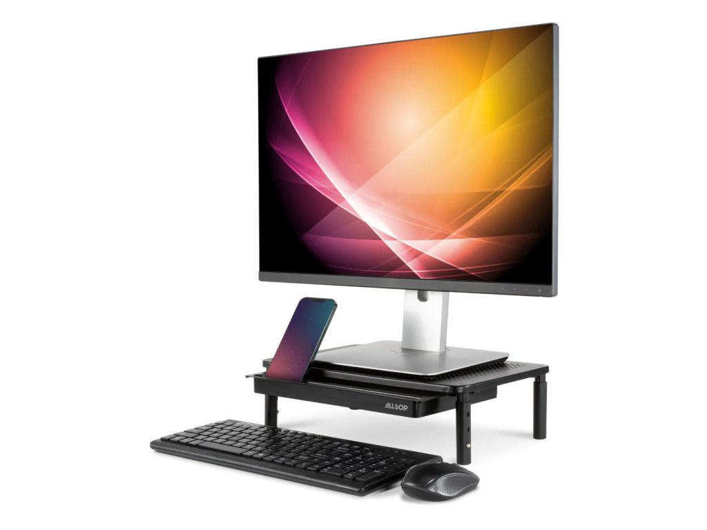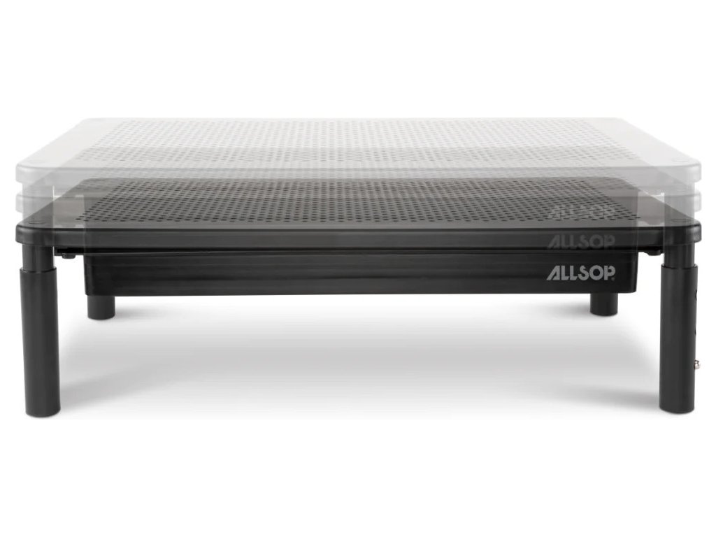Trojúrovňový stojan na monitor Allsop Metal Art má odolnou kovovou platformu s práškovým nástřikem s perforovanými otvory s mikrotečkami a podporuje monitory až do hmotnosti 35 lb a 27 palců. Teleskopické nohy umožňují uživatelům vybrat si ze tří úrovní výšky (4,13 palce, 5,0 palce nebo 5,75 palce) pro ideální ergonomický komfort. Integrovaná úložná zásuvka je ideálním místem pro další zásoby a má slot pro telefon pro snadný přístup.