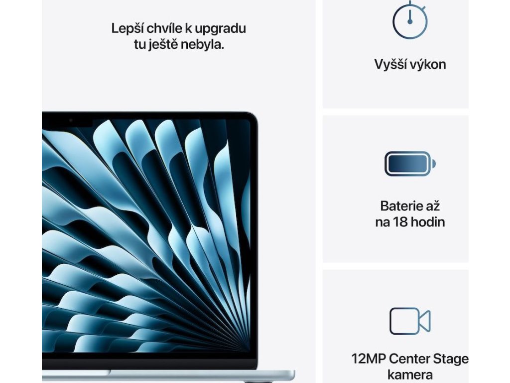 Displej: 13,6" Liquid Retina s LED podsvícením a technologií IPS, 2560×1664 při 224 pixelech na palec, True Tone, 500 nitů