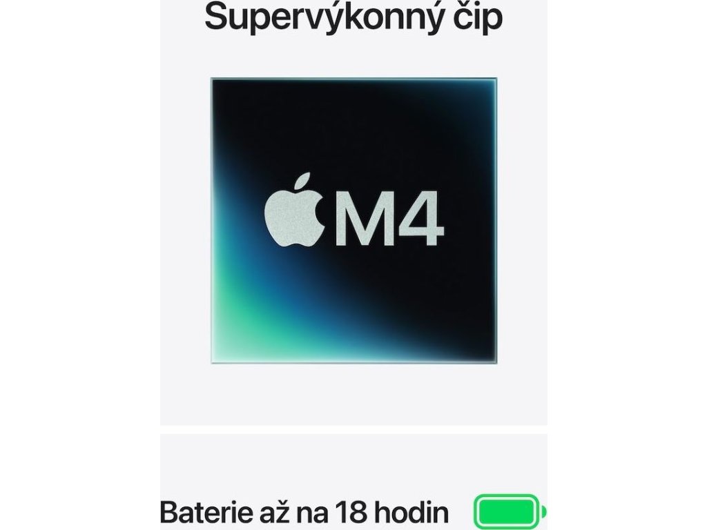 Procesor: Apple M4, 10 jádrové CPU (4P+6E), 10 jádrové GPU, 16 jádrový Neural Engine, propustnost 120GB/s