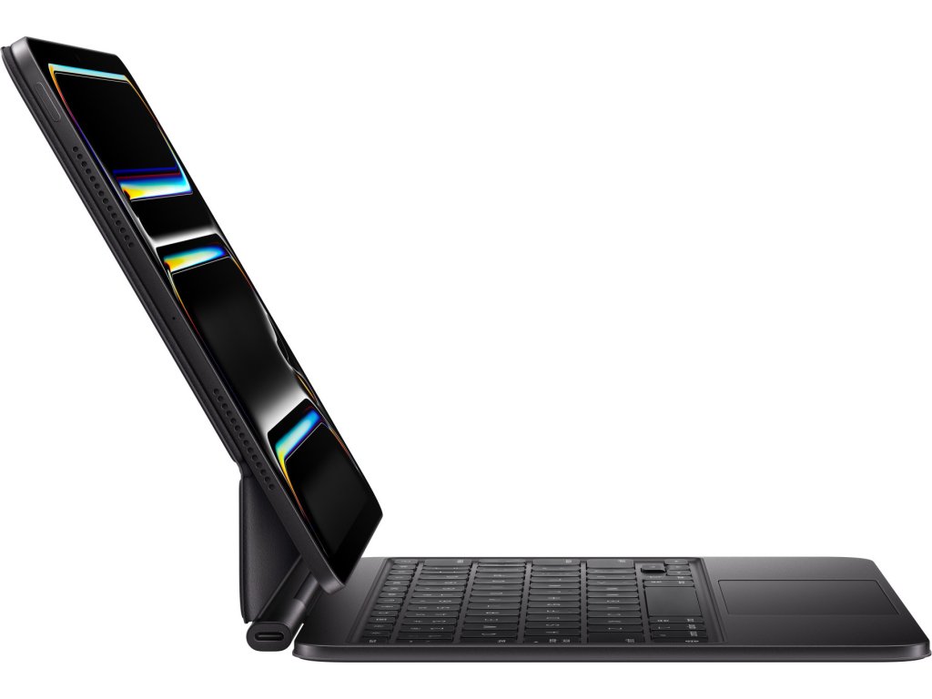 Magic Keyboard pro iPad Pro slouží jako klávesnice plné velikosti a elegantní pouzdro v jednom. Dá se nastavit do různých úhlů pro komfortní sledování obrazovky. Podsvícení kláves a přítomnost touchpadu s haptickou odezvou přináší maximální efektivitu i pohodlí při práci. Řádek 14 funkčních kláves umožňuje pohotově ovládat jas, hlasitost a další funkce. Na boční straně se nachází port USB-C, skrze který lze iPad nabíjet.