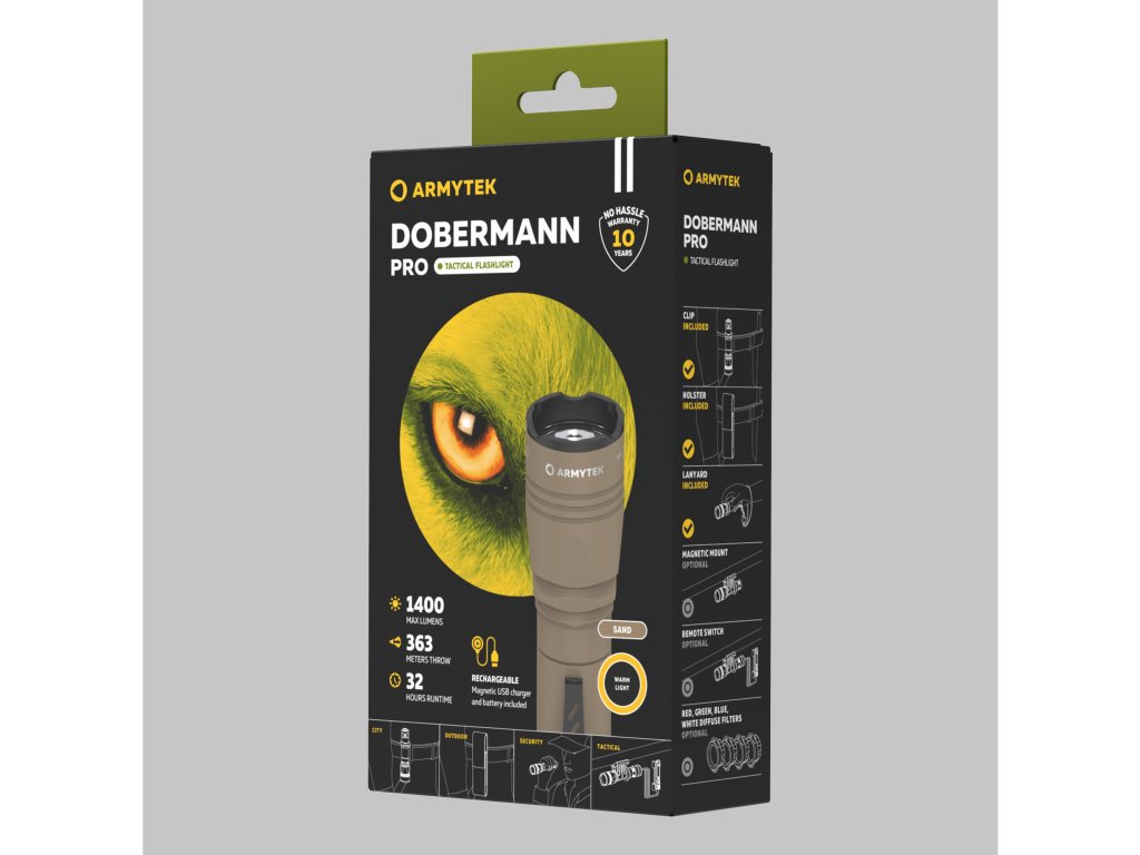 Dobermann Pro je model s úzkym lúčom svetla a plynulým prechodom medzi hotspotom a únikom. Kombinácia kompaktného tela a pôsobivých svetelných vlastností robí z Dobermann Pro baterku 2 v 1 pre taktické a každodenné použitie.