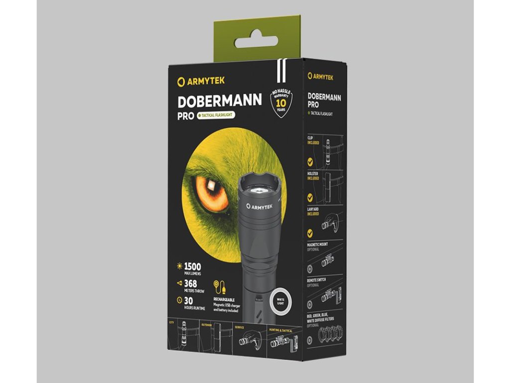 Dobermann Pro je model s úzkym lúčom svetla a plynulým prechodom medzi hotspotom a únikom. Kombinácia kompaktného tela a pôsobivých svetelných vlastností robí z Dobermann Pro baterku 2 v 1 pre taktické a každodenné použitie.