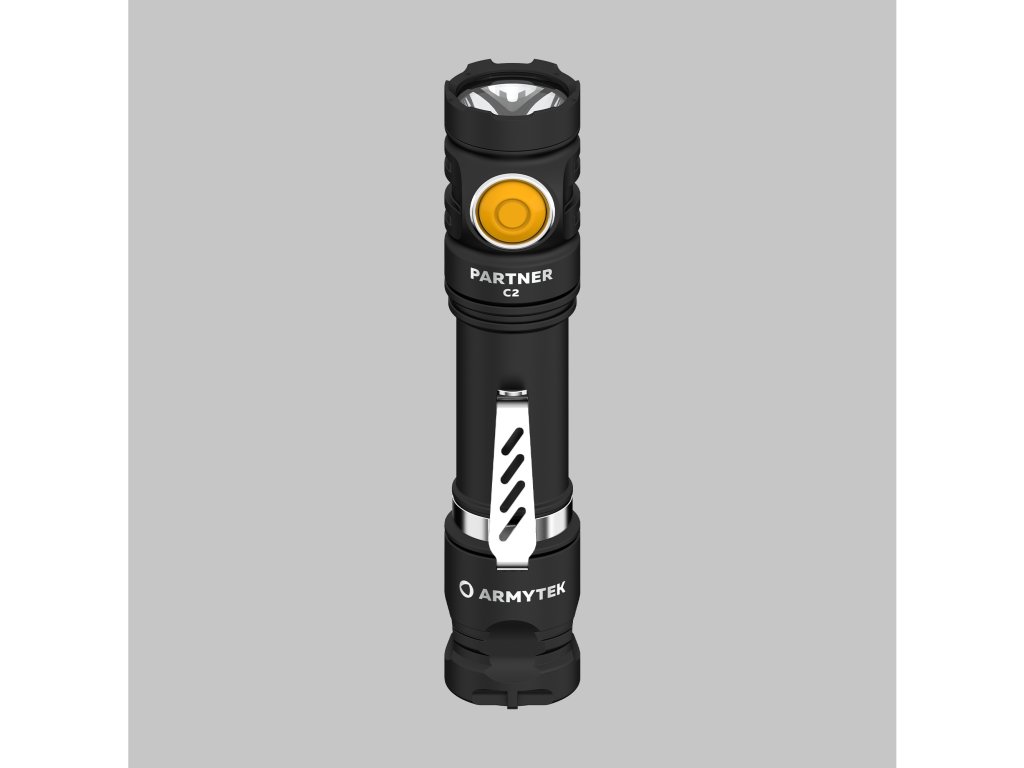 Univerzálny pomocník na doma, na túre alebo na rybačku, Partner C2 môže nahradiť väčší taktický model pri love alebo bezpečnostnej hliadke. Telo klasického tvaru je vybavené dvomi ovládacími tlačidlami: ploché taktické tlačidlo umožňuje rýchle zapnutie a vypnutie baterky v taktickom podržaní a veľké bočné tlačidlo prepína režimy. Rovnako ako modely taktickej zostavy Armytek, aj Partner C2 má možnosť stáleho a dočasného zapnutia (polovičným stlačením taktického tlačidla až do jeho uvoľnenia). Setová konfigurácia baterky obsahuje nylonové puzdro, oceľovú sponu a paracordovú šnúrku, ktorá zaisťuje pohodlné upevnenie baterky na opasok, odev alebo vybavenie. Svietidlo je kompatibilné s voliteľným príslušenstvom: s držiakmi na zbrane a farebnými filtrami pre taktické použitie, ako aj s držiakom na bicykel ABM-01 pre cyklistiku.