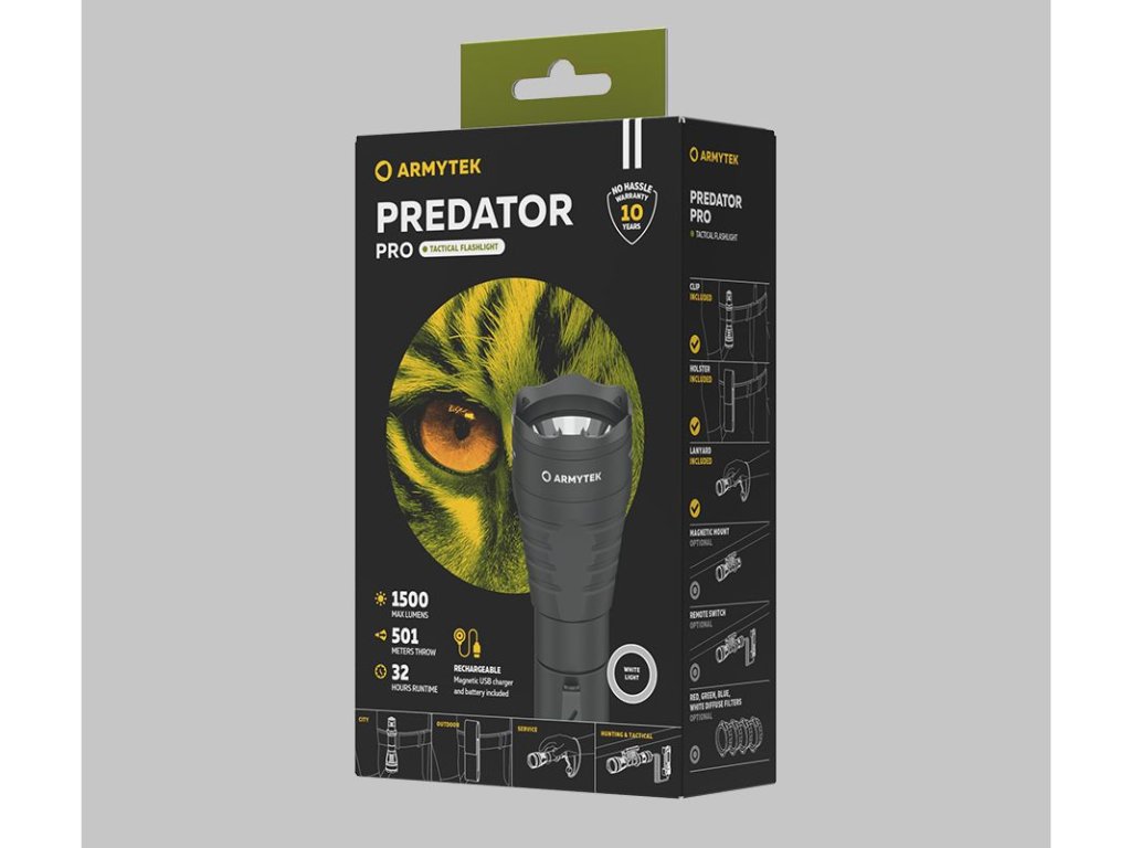 Predator Pro je taktický model s úzkym lúčom pôsobivého vrhu pre špecializované úlohy a lov. Baterka novej generácie si zachovala tie najlepšie vlastnosti predchádzajúcej verzie a zároveň dostala high-tech aktualizáciu.