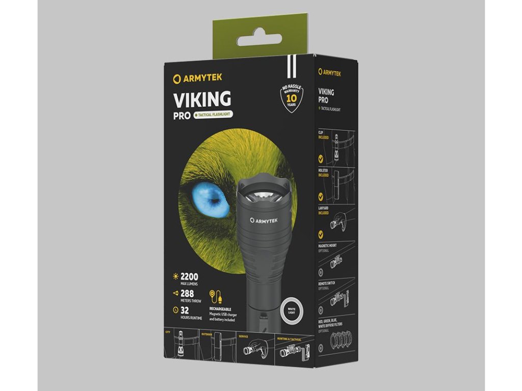 Viking Pro je taktická baterka novej generácie s jemným širokým svetlom na lov v otvorených priestoroch a na špeciálne úlohy. Baterku možno použiť hneď po vybalení: sada teraz obsahuje vysokokapacitnú batériu a rýchlu magnetickú nabíjačku.