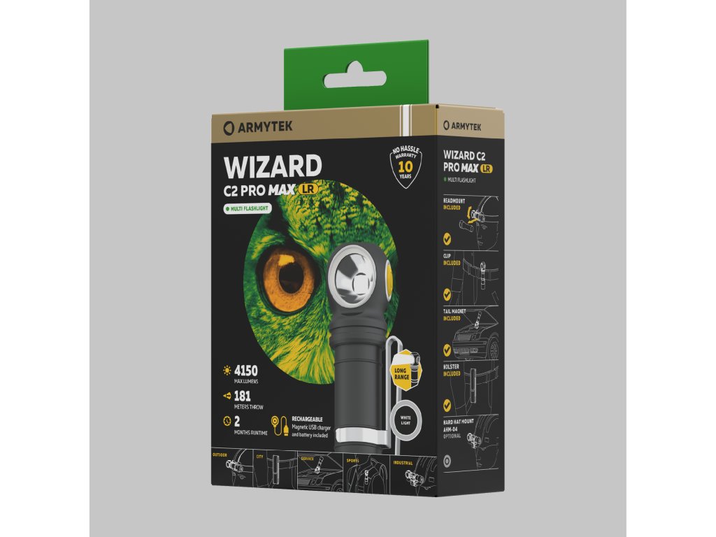 Svietidlo funguje na pribalenú 21700 Li-Ion batériu alebo na jednu štandardnú 18650 Li-Ion batériu pomocou adaptéra. Hlavový držiak, klip, puzdro, magnet v zadnej časti a voliteľný držiak na bicykel ABM-01 poskytujú rôzne možnosti uchytenia pre pohodlné každodenné použitie a pre športové aktivity. Wizard C2 Pro Max LR je tiež kompatibilný s originálnymi držiakmi na prilbu pre priemyselné práce a horolezectvo.