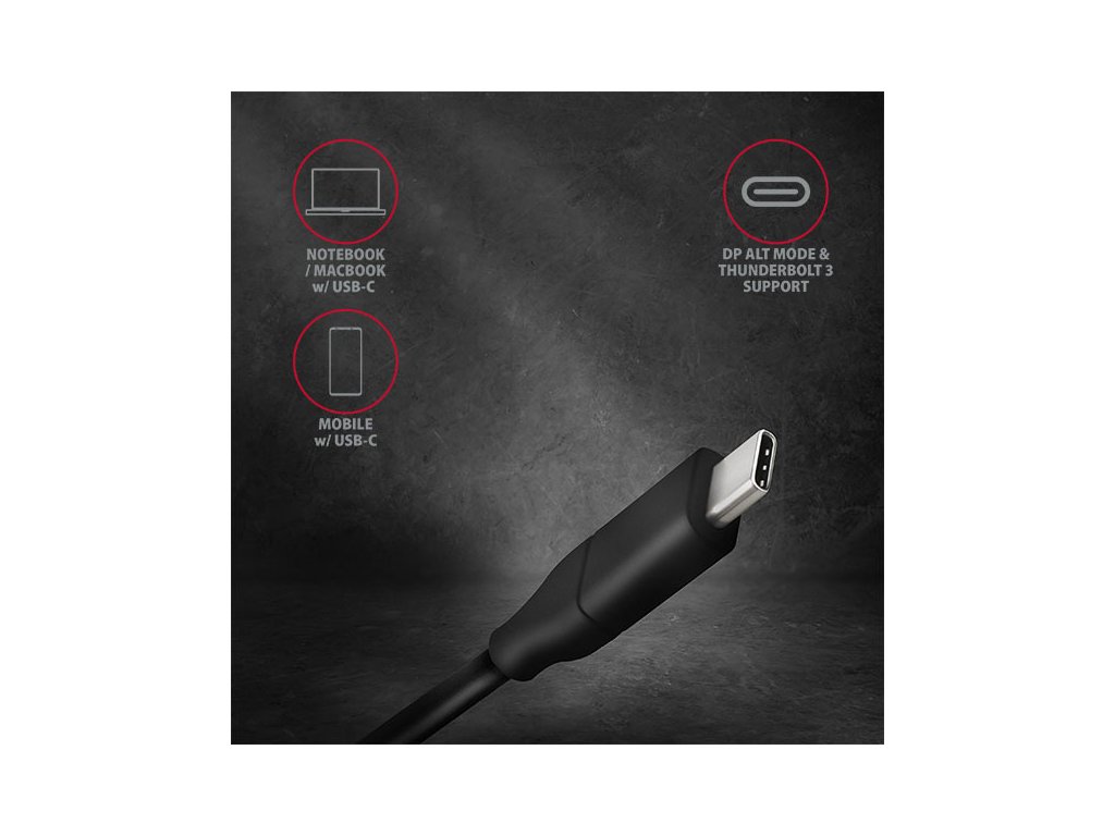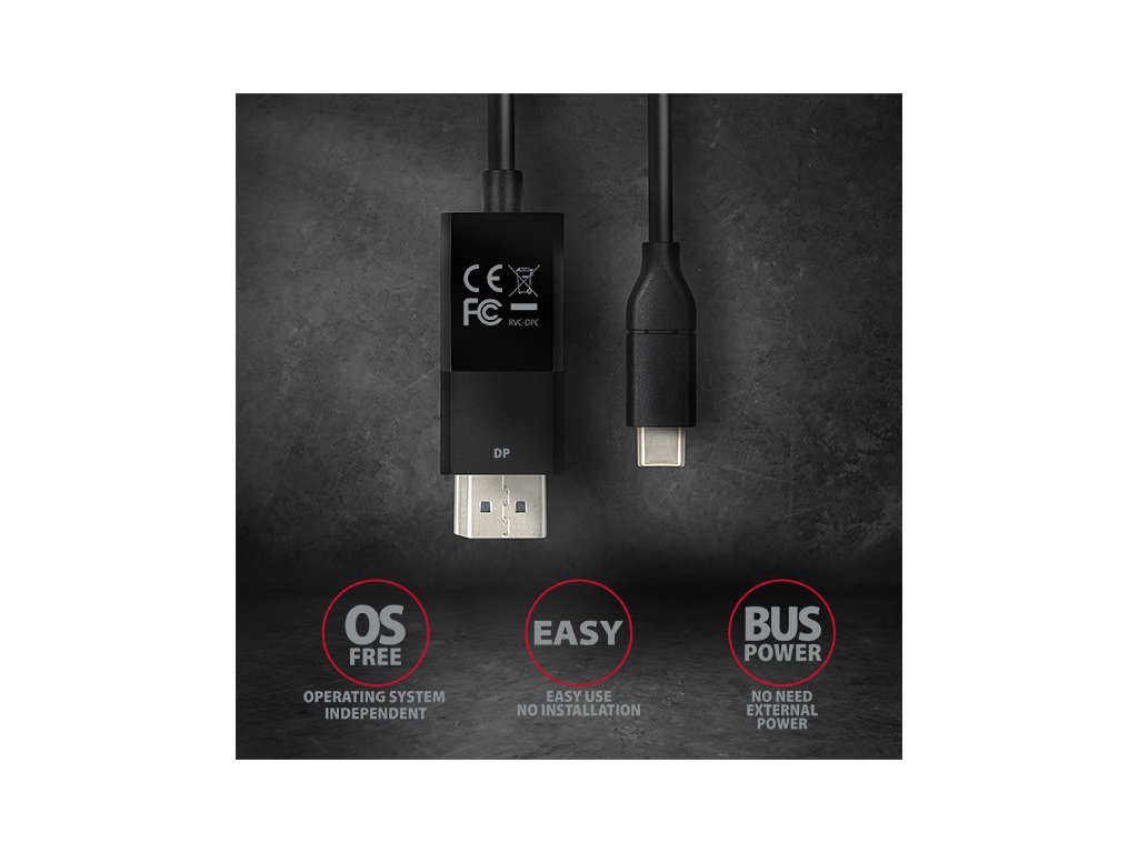 Aktivní USB-C -> DisplayPort kabel - redukce AXAGON RVC-DPC pro připojení DisplayPort monitoru/TV/projektoru k notebooku nebo telefonu pomocí USB-C konektoru.