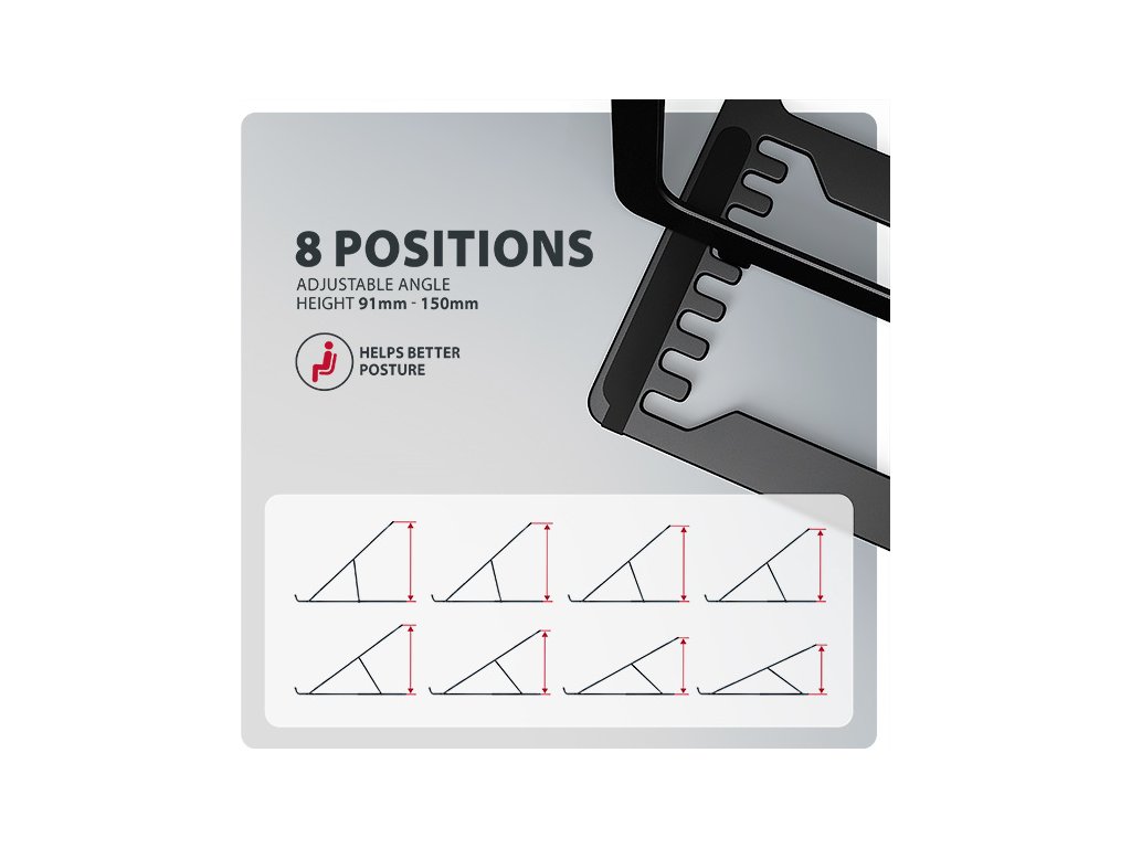 Velkou výhodou je možnost nastavení až osmi poloh. Díky tomu můžete notebook zvednout do výšky od 91 do 150 mm. Tím získáte další pracovní plochu ve správné úrovni očí, což výrazně zlepšuje ergonomii a pohodlí při práci, a zároveň zvyšuje vaši produktivitu.