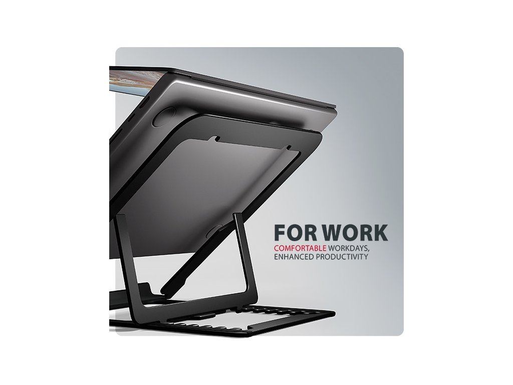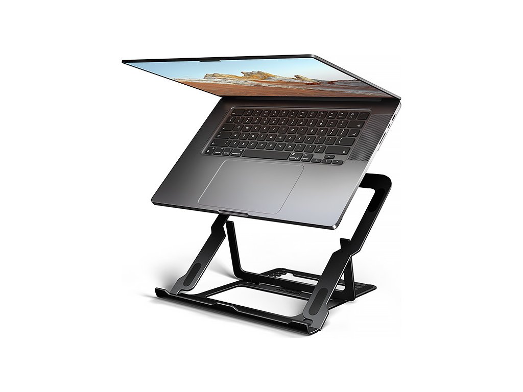 Stojan lze snadno složit do kompaktních rozměrů, což umožňuje pohodlné přenášení kamkoli potřebujete. Jeho elegantní design v černé barvě nejen stylově doplní váš pracovní stůl, ale také přináší praktické funkce, které oceníte při každodenním používání.