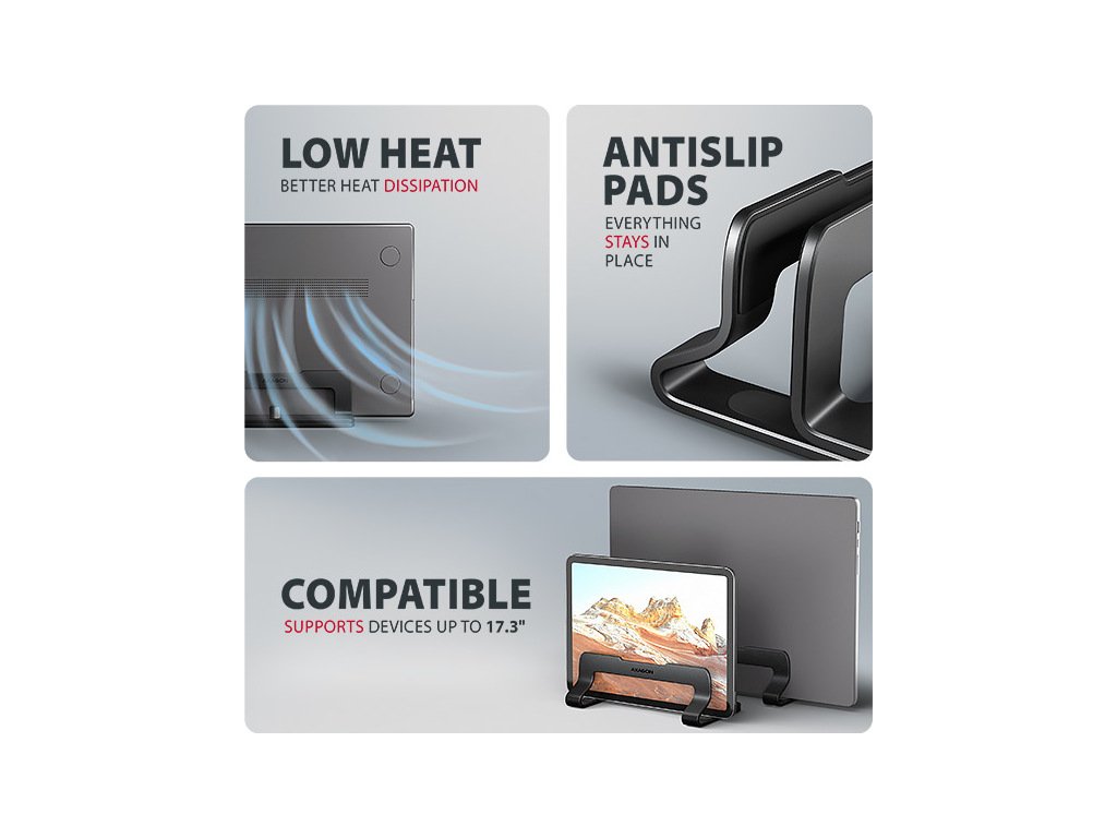 Vertikální stojan poskytuje notebooku více prostoru kolem ventilátorů, což zajišťuje účinnější odvod tepla a pomáhá udržet stabilní výkon i delší životnost zařízení. Zároveň udržuje klávesnici čistší a chrání notebook před prachem i náhodným politím, protože je zvednutý nad pracovní plochu.