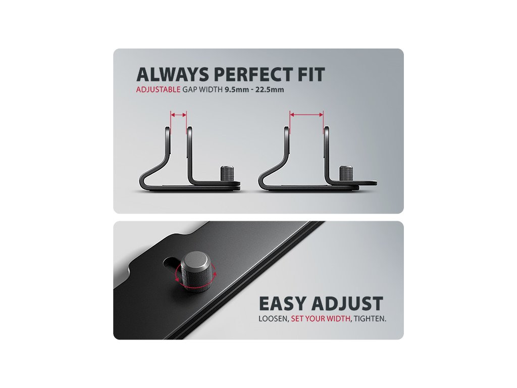 Výhodou je nastavitelné rozpětí stojanu od 9.5 mm do 25.5 mm, díky kterému do něj snadno vložíte většinu notebooků. Nastavenou šířku spolehlivě udrží broušený regulační šroub, který pevně zafixuje požadovanou polohu.