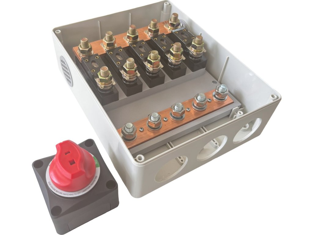 Bateriový box slouží pro paralelní propojení 4 baterií a 1 měniče v napěťové hladině 48 V DC. Box je vybaven pojistkami 100 A pro jednotlivé baterie a 250 A pro výstup k měniči. Box je dobře připraven na instalaci přívodních i odchozích kabelů díky trojici otvorů na spodní straně krabice. K boxu je dodáván s odpojovačem pro DIY instalaci.