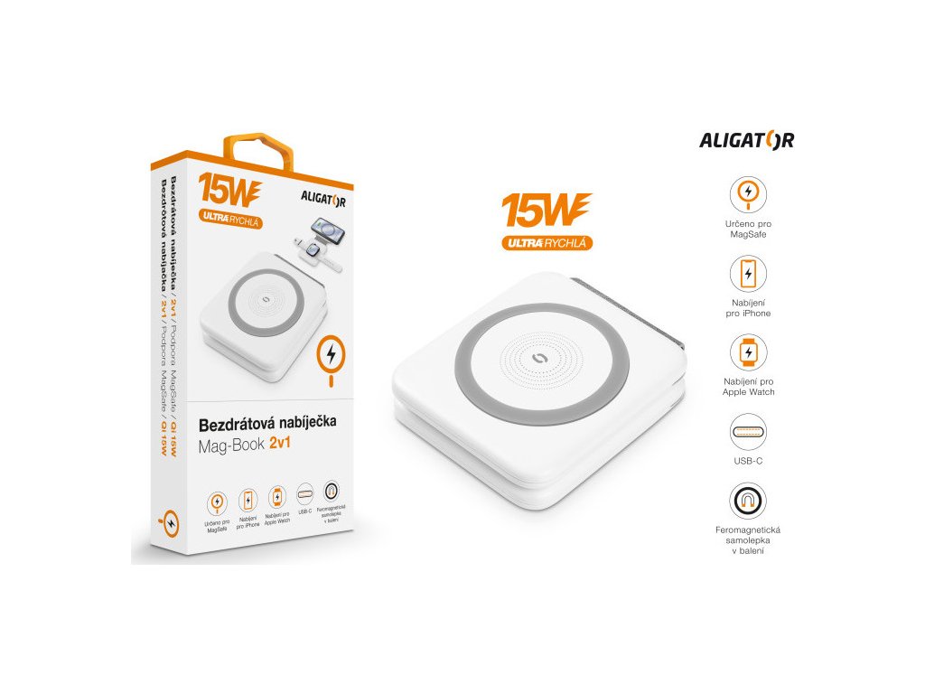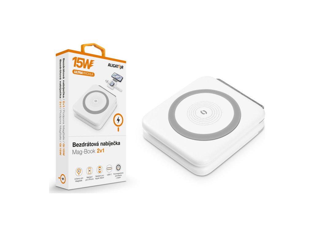 Kompaktní zpracování v elegantní bílé barvě s možností využití obou stran, praktickým stojánkem pro Apple Watch a 1m dlouhým USB-C/USB-C kabelem, to je bezdrátová nabíječka 2v1 Aligator Mag-Book. Součástí balení je také feromagnetická samolepka, díky které můžete rozšířit kompatibilitu u pouzder, které tuto technologii nepodporují.
