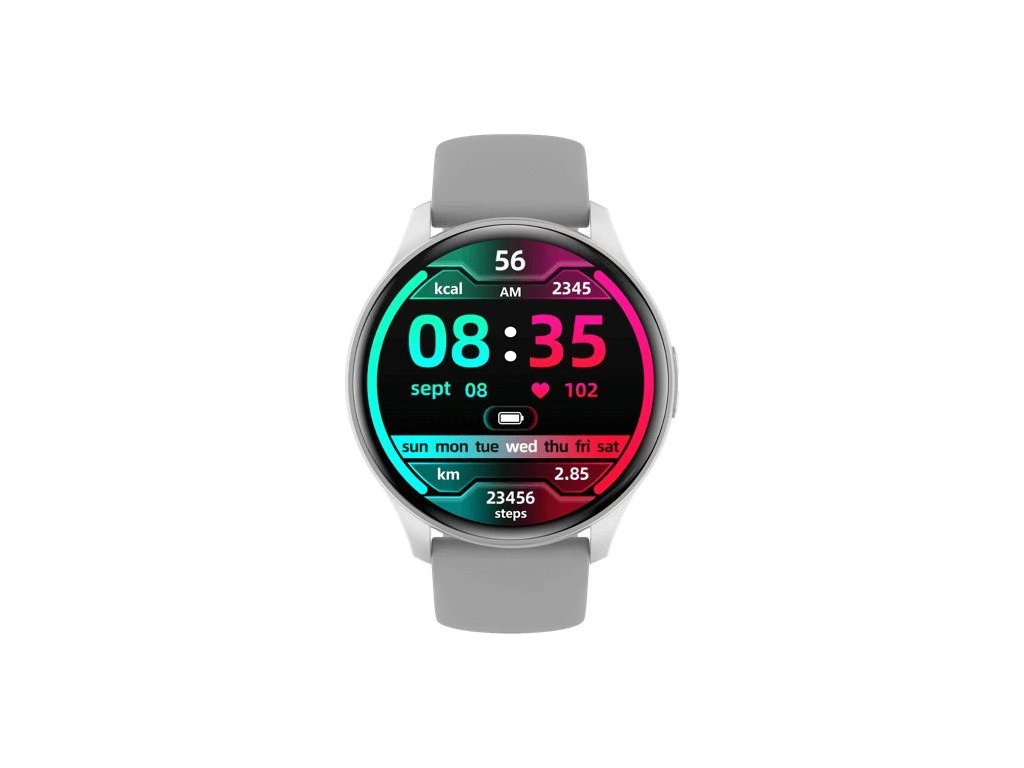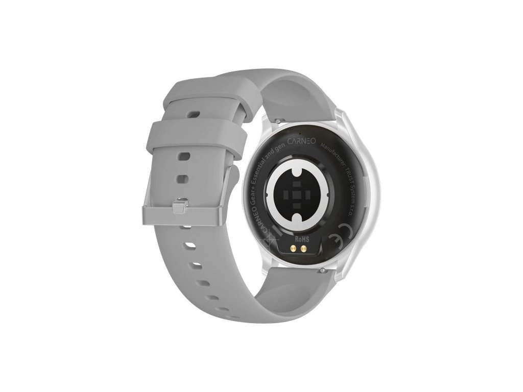 Moderní, fitness hodinky CARNEO Gear Essential druhé generace ve stříbrné barvě se světle šedým na dotek velmi příjemným silikonovým řemínkem a barevným SUPER AMOLED displejem s vysokým jasem a funkcí trvalého zobrazení času. Monitorují vaši denní aktivitu, úroveň stresu a lze je spárovat s mobilním telefonem a upozornit Vás na příchozí hovor nebo SMS. Hodinky umožňují telefonovat, aniž byste vytáhli telefon z tašky s vestavěným mikrofonem a reproduktorem až do vzdálenosti 10 m od telefonu.