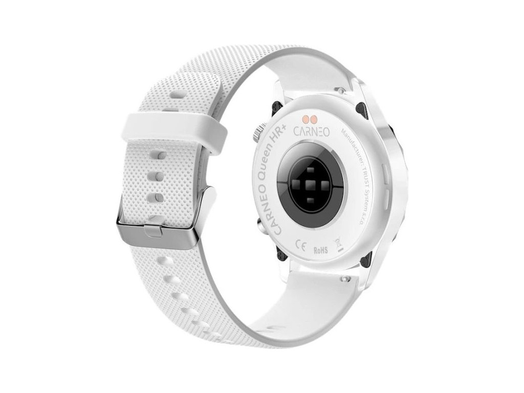 Moderní nadčasové fitness hodinky CARNEO Queen HR+ v bílém provedení se stříbrnou korunkou a bílou, na dotek velmi příjemnou barvou, silikonovým řemínkem a SUPER AMOLED displejem s vysokým jasem a funkcí trvalého zobrazení času monitorují vaši denní aktivitu, úroveň stresu, ale lze je spárovat s mobilním telefonem a upozornit vás na příchozí hovor nebo SMS. Hodinky umožňují telefonovat, aniž byste museli telefon vyndat z tašky, díky vestavěnému mikrofonu a reproduktoru až do vzdálenosti 10 m od telefonu. Jejich bezchybné kovové tělo s nadčasovými outdoorovými křivkami je tak návykové, že je po prvním nošení nebudete chtít sundat ze zápěstí. Mimořádně odolné minerální sklo chrání křišťálově čistou obrazovku před poškrábáním.