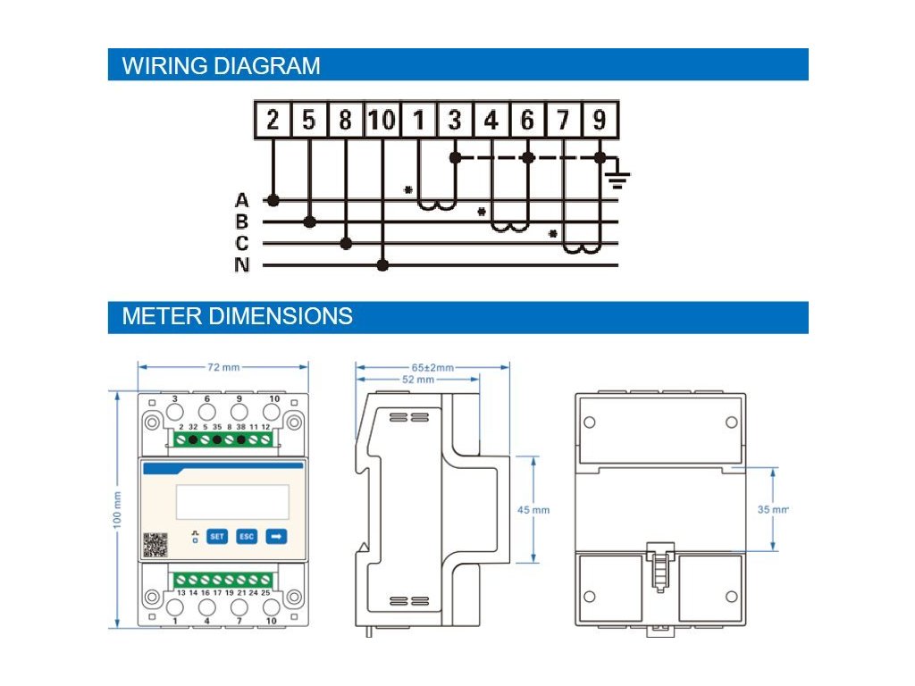 Kompaktní konstrukce elektroměru umožňuje rychlou montáž na DIN lištu 35 mm, což šetří místo v rozvaděči a zjednodušuje instalaci. Vizuální identifikace svorek minimalizuje riziko chyb při zapojení. Podpora sítí 3P4W a 3P3W spolu s možností měření proudu až do 250 A zajišťuje univerzální použití s trojfázovými měniči i dalšími energetickými prvky. Rozhraní RS485 s protokolem Modbus-RTU umožňuje snadnou integraci do nadřazených systémů řízení.