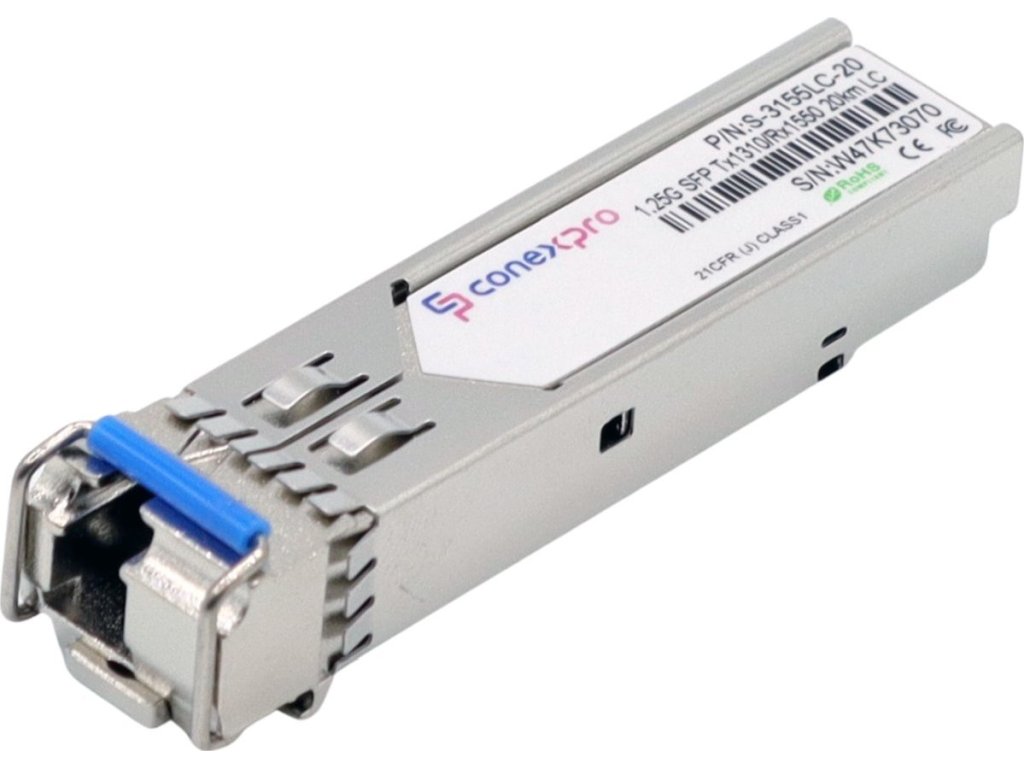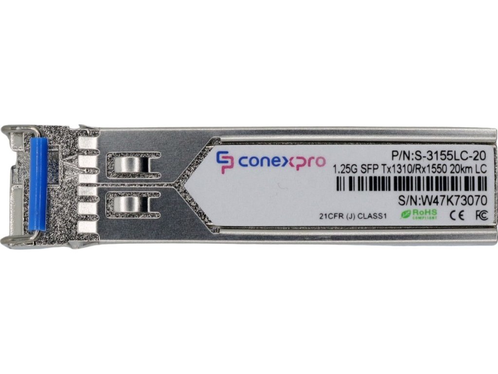 Gigabitový WDM/Bidi Singlemode SFP modul od výrobce Conexpro s vlnovou délkou (Tx/Rx) 1310/1550 nm, rychlostí 1 Gbps, vybavený jedním LC konektorem s UPC broušením a je určený pro spojení na vzdálenost až 20 km. Tento modul poskytuje univerzální kompatibilitu, což znamená, že je schopen spolupracovat s téměř všemi dostupnými aktivními prvky. Samozřejmostí je podpora diagnostiky optického spojení pomocí funkce DDM (Digital Diagnostic Monitoring).