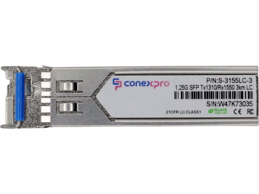 Gigabitový WDM/Bidi Singlemode SFP modul od výrobce Conexpro s vlnovou délkou (Tx/Rx) 1310/1550 nm, rychlostí 1 Gbps, vybavený jedním LC konektorem s UPC broušením a je určený pro spojení na vzdálenost 3 km. Tento modul poskytuje univerzální kompatibilitu, což znamená, že je schopen spolupracovat s téměř všemi dostupnými aktivními prvky. Samozřejmostí je podpora diagnostiky optického spojení pomocí funkce DDM (Digital Diagnostic Monitoring).