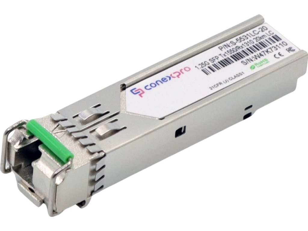 Gigabitový WDM/Bidi Singlemode SFP modul od výrobce Conexpro s vlnovou délkou (Tx/Rx) 1550/1310 nm, rychlostí 1 Gbps, vybavený jedním LC konektorem s UPC broušením a je určený pro spojení na vzdálenost 20 km. Tento modul poskytuje univerzální kompatibilitu, což znamená, že je schopen spolupracovat s téměř všemi dostupnými aktivními prvky. Samozřejmostí je podpora diagnostiky optického spojení pomocí funkce DDM (Digital Diagnostic Monitoring).