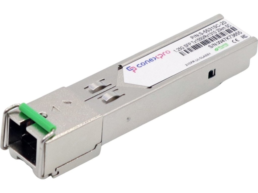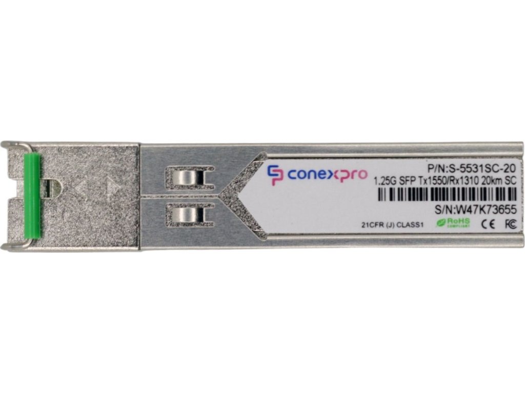 Gigabitový WDM/Bidi Singlemode SFP modul od výrobce Conexpro s vlnovou délkou (Tx/Rx) 1550/1310 nm, rychlostí 1 Gbps, vybavený jedním SC konektorem s UPC broušením a je určený pro spojení na vzdálenost 20 km. Tento modul poskytuje univerzální kompatibilitu, což znamená, že je schopen spolupracovat s téměř všemi dostupnými aktivními prvky. Samozřejmostí je podpora diagnostiky optického spojení pomocí funkce DDM (Digital Diagnostic Monitoring).