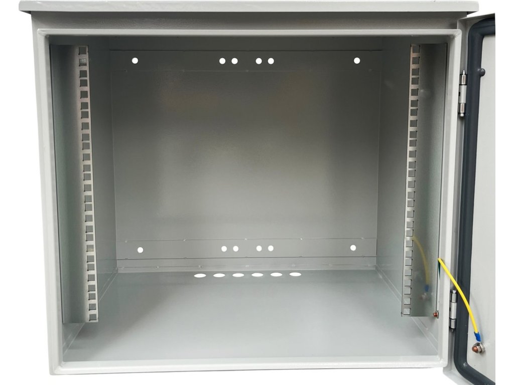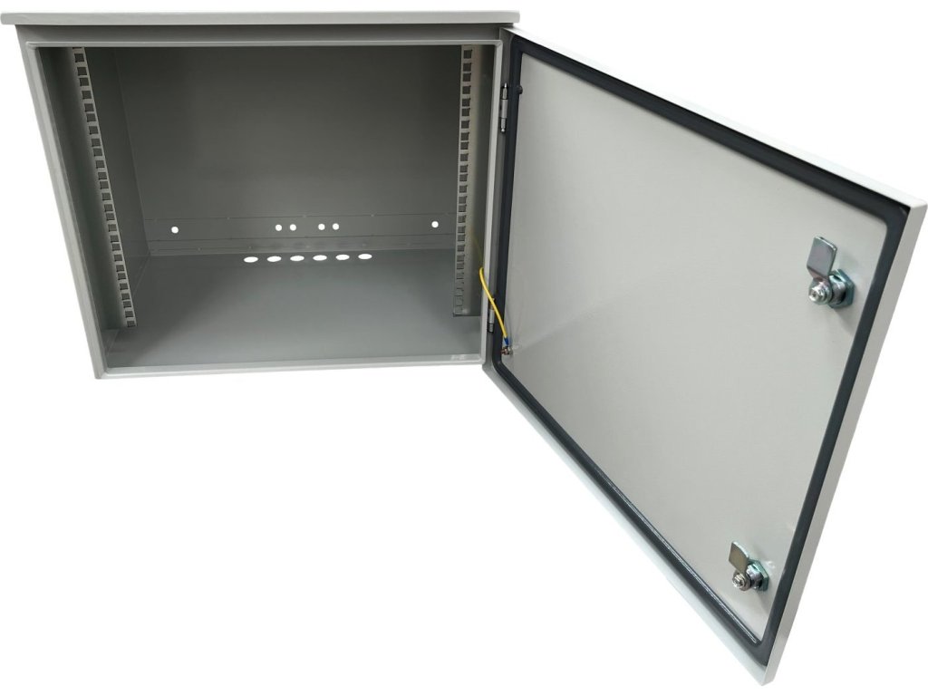 Jednodílný datový rozvaděč ideální pro venkovní nasazení díky odolnému IP65 krytí s montáží na zeď či stožár. Velikost 19", 9U pozic a 410 mm hloubka (325 mm od zadní stěny k rackmount liště) zajišťují dostatečný prostor pro vaše síťová zařízení. Rozvaděč je konstruován z 1,5 mm ocelových plechů, s elegantní šedou barvou (RAL7032) a dvojicí zámků se stejným klíčem pro jednoduchou bezpečnost. Spodní strana obsahuje 6 otvorů o průměru 25 mm s gumovými průchodkami a zadní strana 12 otvorů pro přichycení na zeď či stožár - k nevyužitým otvorům jsou v balení gumové záslepky. Celkové rozměry rozvaděče jsou 560 x 500 x 410mm, čímž je zajištěna kompaktní a efektivní instalaci.