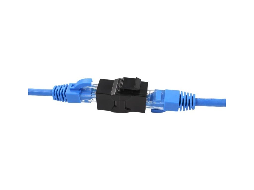 UTP spojka v černém provedení slouží ke spojení dvou síťových kabelů kategorie CAT6A a nižších. Tato spojka disponuje 2 porty RJ45, umožňující spojit dva síťové kabely v případě nedostatečné délky původního kabelu. Spojka je jako keystone a lze ji montovat do datových zásuvek, neosazených patch panelů nebo ji díky její menší velikosti použít jako klasickou RJ45 spojku.