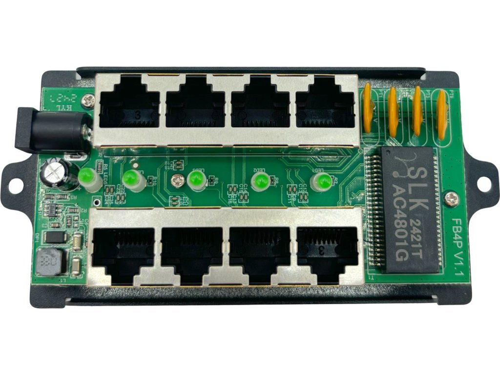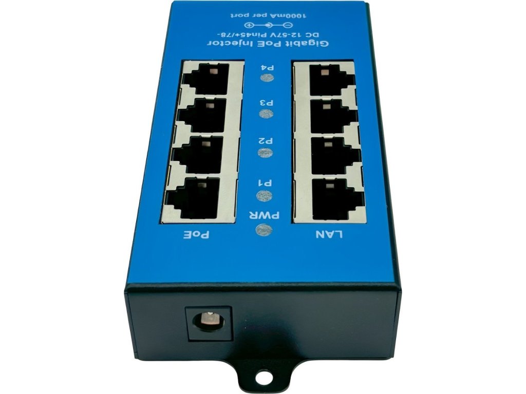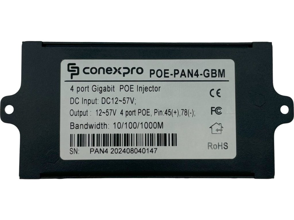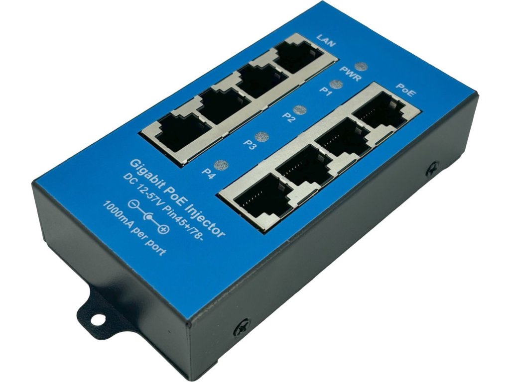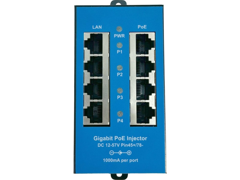 Pasivní Gigabitový PoE injektor v kovovém šasi určený pro napájení až čtyř zařízení s podporou pasivního PoE. Ethernetové porty označené jako LAN slouží k připojení do switche či routeru, zatímco na straně PoE se připojují zařízení využívající pasivní PoE, tedy napájení prostřednictvím ethernetového kabelu. K napájení se využívají dva páry v ethernetovém kabelu: 4,5 (kladný pól) a 7,8 (záporný pól). Napájení panelu je řešeno přes standardní napájecí konektor o velikosti 2.1/5.5 mm.