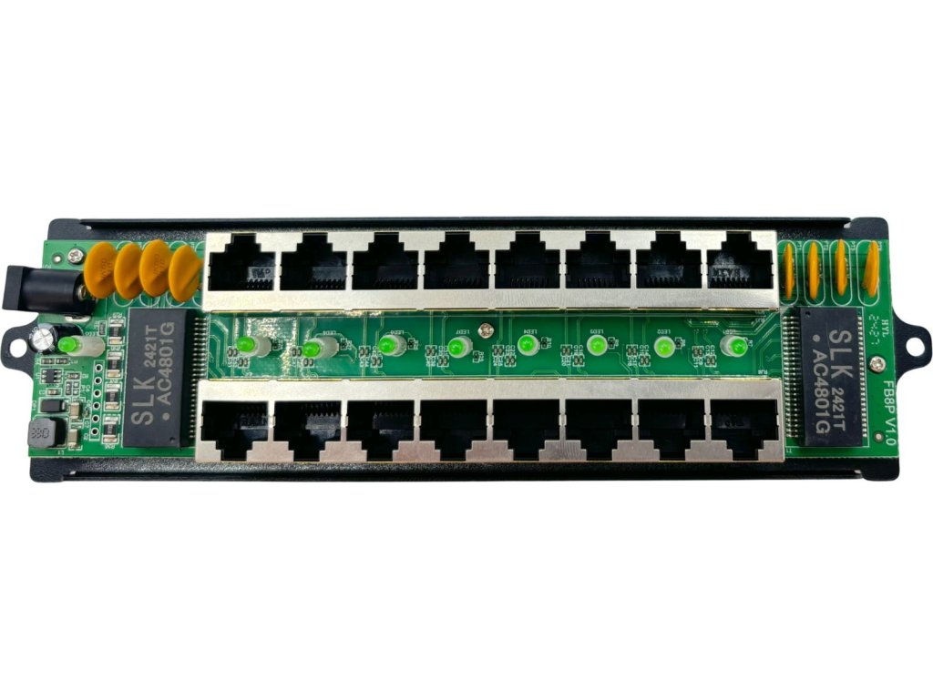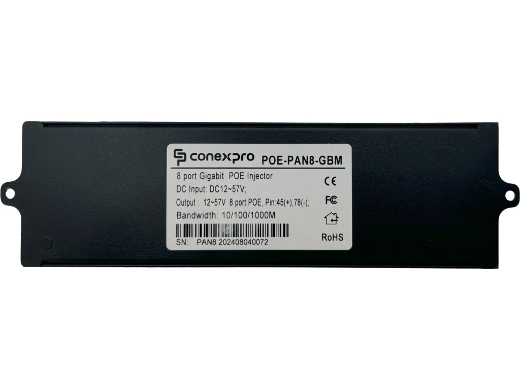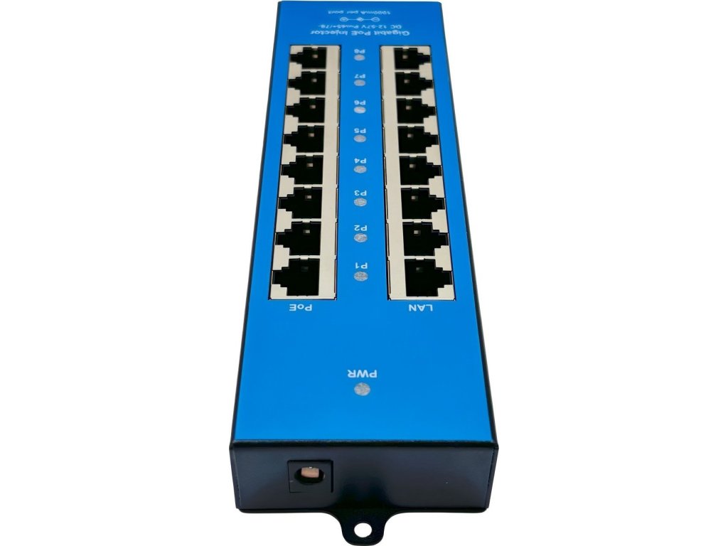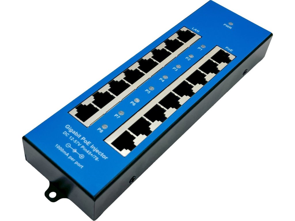 Pasivní Gigabitový PoE injektor v kovovém šasi určený pro napájení až osmi zařízení s podporou pasivního PoE. Ethernetové porty označené jako LAN slouží k připojení do switche či routeru, zatímco na straně PoE se připojují zařízení využívající pasivní PoE, tedy napájení prostřednictvím ethernetového kabelu. K napájení se využívají dva páry v ethernetovém kabelu: 4,5 (kladný pól) a 7,8 (záporný pól). Napájení panelu je řešeno přes standardní napájecí konektor o velikosti 2.1/5.5 mm.