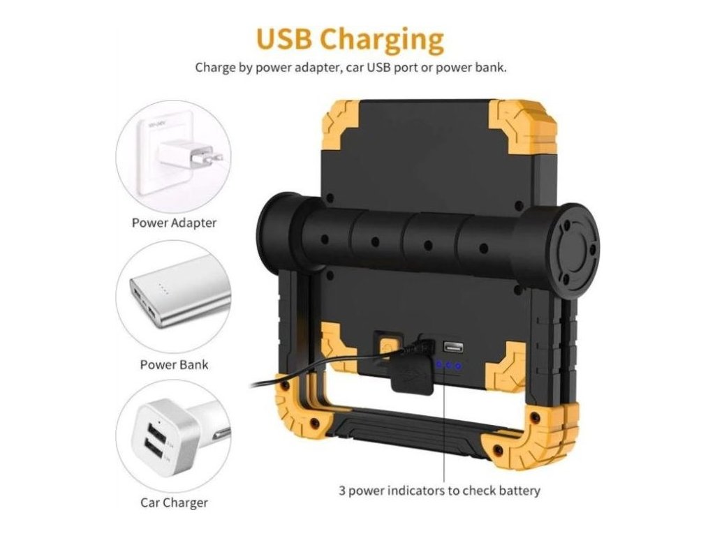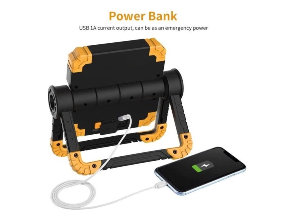 Pracovní světlo s držákem a powerbankou je ideální pro všechny, kteří potřebují mobilní světlo při práci na stavbách, či na cestách. Obsahuje 2x svítilnu s možností natočení do různých stran, nabíjecí Micro USB port a dodatečný USB port pro dobíjení vašeho telefonu nebo jiného zařízení. Vestavěný akumulátor s kapacitou 5000 mAh umožňuje až 6 hodin svitu, přičemž čas nabíjení je pouhých 7,5 hodin. Světlo je vybaveno COB LED s výkonem 10 W, který poskytuje dostatečný světelný tok. Navíc signalizuje stav nabití baterie, takže vždy víte, kdy je čas na dobití.