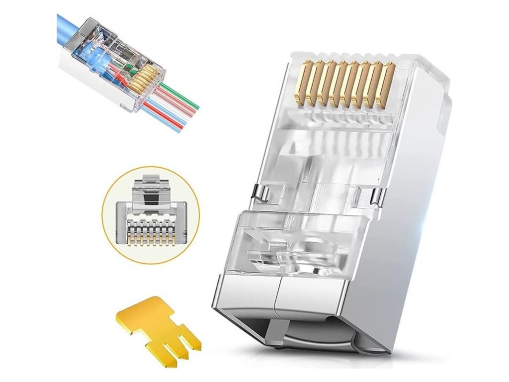 Průchozí Wire Cross datový RJ45 konektor pro strukturovanou kabeláž pro vodič typu drát. Jedná se o univerzální stíněný RJ45 konektor třídy CAT6 se zapojením 8P8C, zajišťující efektivní a jednoduché nakrimpování konektoru na datový kabel. Průchozí konektory typu Wire Cross jsou navrženy tak, aby usnadnily práci a ušetřily čas jak začátečníkům, tak zkušeným technikům. Hlavní výhoda Wire Cross spočívá v tom, že protáhnete všech 8 vodičů skrz konektor a kromě nakrimpování dojde i k zaříznutí přebytečné délky jednotlivých vodičů díky ostrému břitu integrovanému v rukojeti kleští.