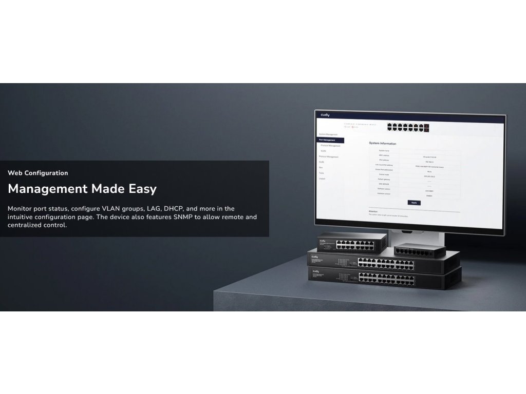 Pokročilé možnosti řízení umožňují detailní nastavení priorit PoE, limitů výkonu i chování jednotlivých portů. Funkce PoE Auto Recovery s watchdogem automaticky restartuje napájení při zamrznutí zařízení, čímž minimalizuje výpadky. Samozřejmostí je webová správa a SNMP, podpora VLAN, QoS, agregace portů, STP/RSTP i ochranné mechanismy jako DHCP snooping a IGMP Snooping. Výsledkem je flexibilní, bezpečná a snadno ovladatelná síť připravená na náročný provoz.