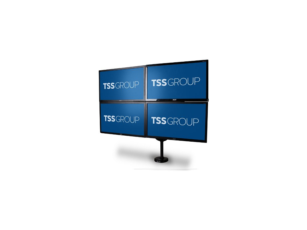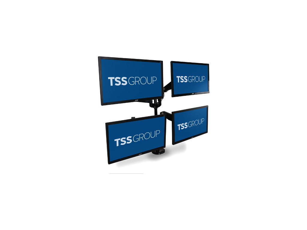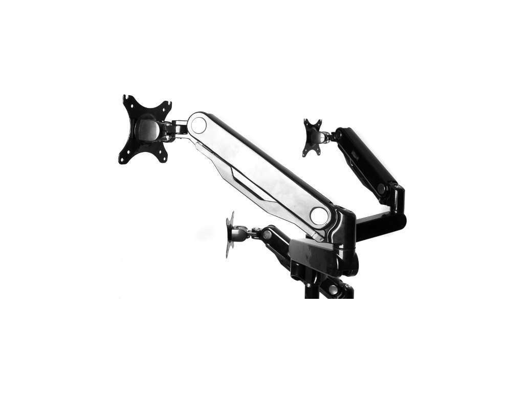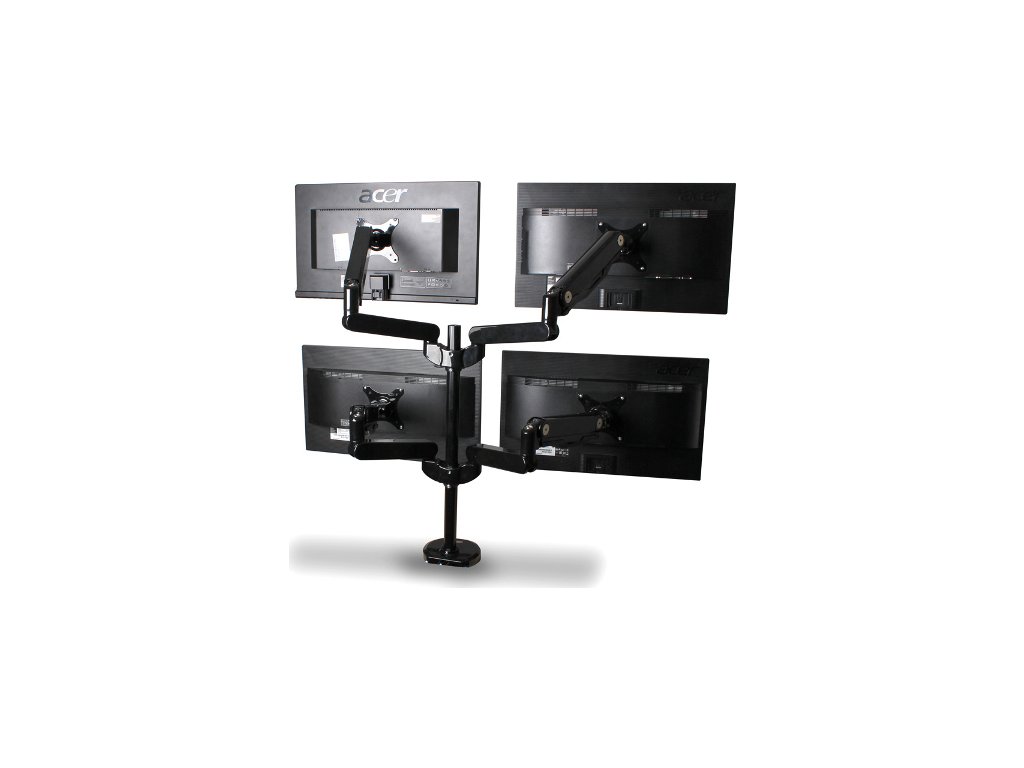 Držiak na 4 monitory o veľkosti 10–27", monitory možné uchytiť pomocou VESA, držiak je určený na inštaláciu na dosku stola s hrúbkou 20–120 mm, materiál letecký hliník, každé rameno má nosnosť 9 kg, uhol natočenia ± 90°, rotácia ± 180°, vstavaný USB 3.0 hub - dva porty, rozmery max. výška 812 mm max. rozpätie 1074 mm