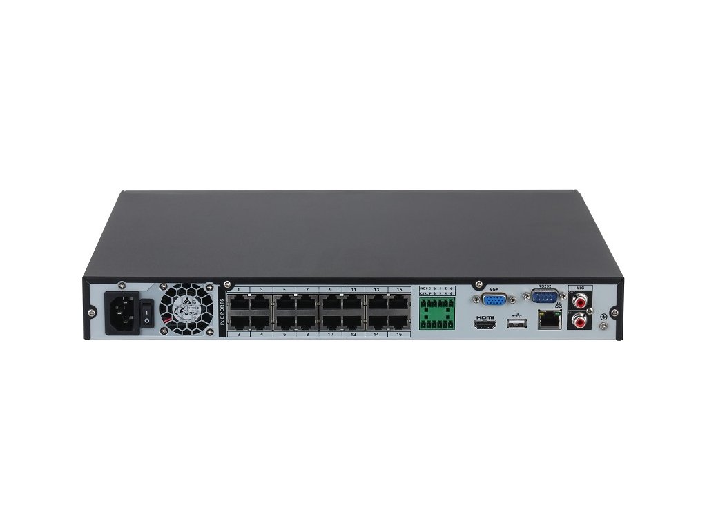 IP videorekordér 16 kanálový, kódovanie Smart H.265+ / H.265 / Smart H.264+ / H.264, AI disabled: 160 Mbps incoming, 160 Mbps recording, 80 Mbps outgoing, AI enabled: 80 Mbps incoming, 80 Mbps recording, 60 Mbps outgoing, rozlíšenie kamery max. 12 Mpx, AI funkcie na NVR: SMD Plus 4 kanály, AI funkcie z kamier: Perimeter protection 6 kanálov, Face Detection 6 kanálov, Face Recognition 6 kanálov, SMD Plus 6 kanálov, 16x RJ-45 PoE Port (IEEE 802.3 af/at), maximálne spolu 130 W a na jeden port 25,5 W, 2x SATA max. 20 TB na 1 disk, RS-232, Audio RCA I/O 1/1, Alarm I/O 4/2, 1x výstup 12 V / 1 A, 2x USB 2.0, 1x HDMI, 1x VGA, 1x 10/100/1000 RJ-45 port, napájanie 100-240 V AC 50/60 Hz, pracovná teplota od -10 °C do +55°C, hmotnosť 2,6 kg, rozmery 375,0 x 327,9 x 53,0 mm