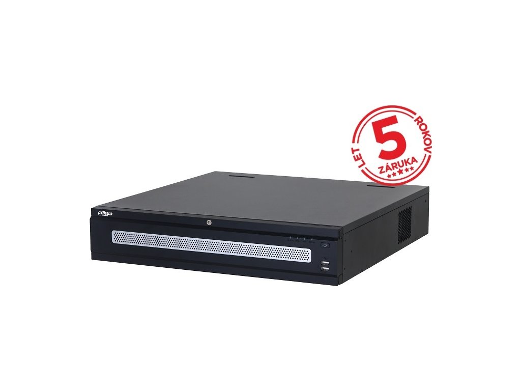 Videorekordér IP sieťový 64-kanálový, záznam / živý obraz / prehrávanie v 4K, OS Linux, procesor Intel, podporované formáty H.264 / H.265 / MJPEG, záznam max. do 1024 Mbps, maximálne rozlíšenie 32 Mpx na kameru, alarm I/O 16/8, 8x SATA III 3.5" HDD, max. 8x 16 TB / HDD (bez HDD), Raid 0 / 1 / 5 / 6 / 10 (podpora HDD Hot-swap), podpora ONVIF, podpora IP PTZ Dahua, videoanalytické funkcie, 2x RJ-45 port (10/100/1000 Mbps), 4x HDMI+ 2x VGA, 1x RS-485, 1x RS-232, 4x USB (z toho 2x USB 3.0), 1x eSATA (pre zálohu), rozmery 1U, 444 × 457 × 95 mm, hmotnosť 6,4 kg (bez HDD)