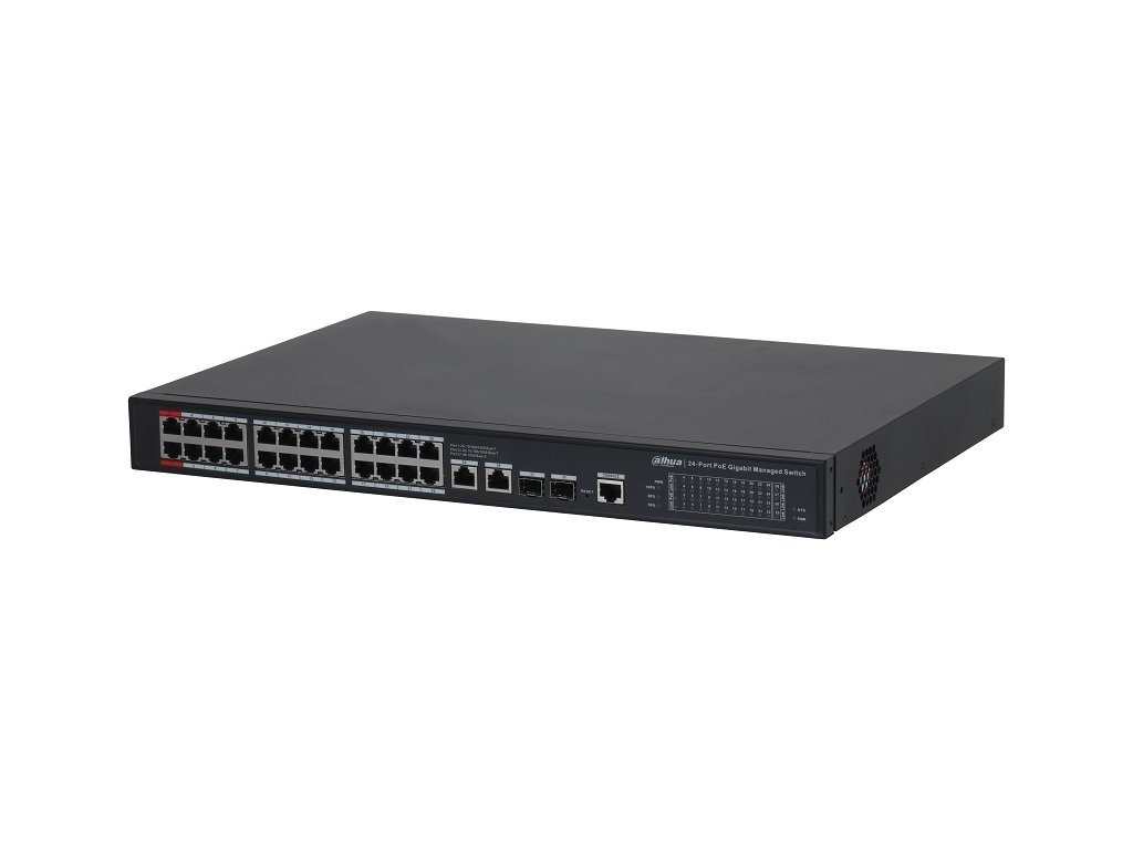 Dahua switch 24x 10/100/1000 PoE, 2x 10/100/1000 RJ-45, 2x SFP 1 Gbps, 1. a 2. port PoE++ (IEEE 802.3bt, 90 W), ostatné porty PoE+ (IEEE 802.3at, 30 W), celkovo na všetky porty max. 360 W, PoE s dosahom do 250 m, Funkcie: DHCP Client, Server, Snooping, STP, RSTP, Layer 2, PD alive mode, napájanie 100–240 VAC, 3,5 A, vhodný pre inštaláciu do racku, ochrana proti blesku do 4 kV, rozmery 440 x 300 x 44 mm, hmotnosť 3,405 kg