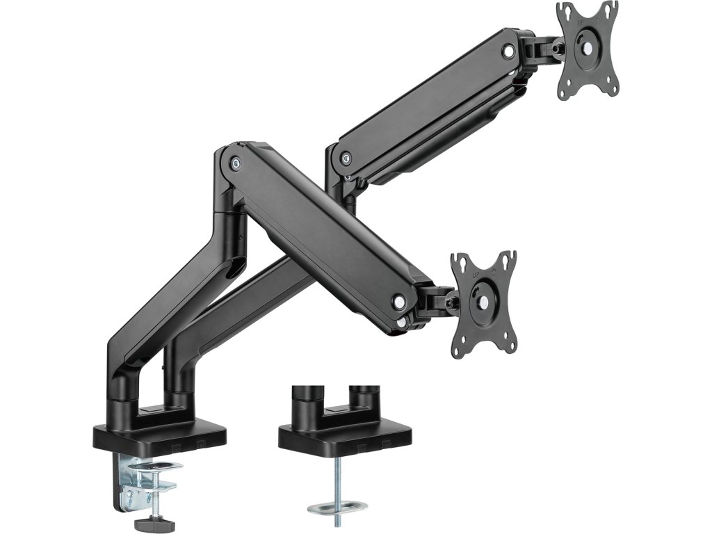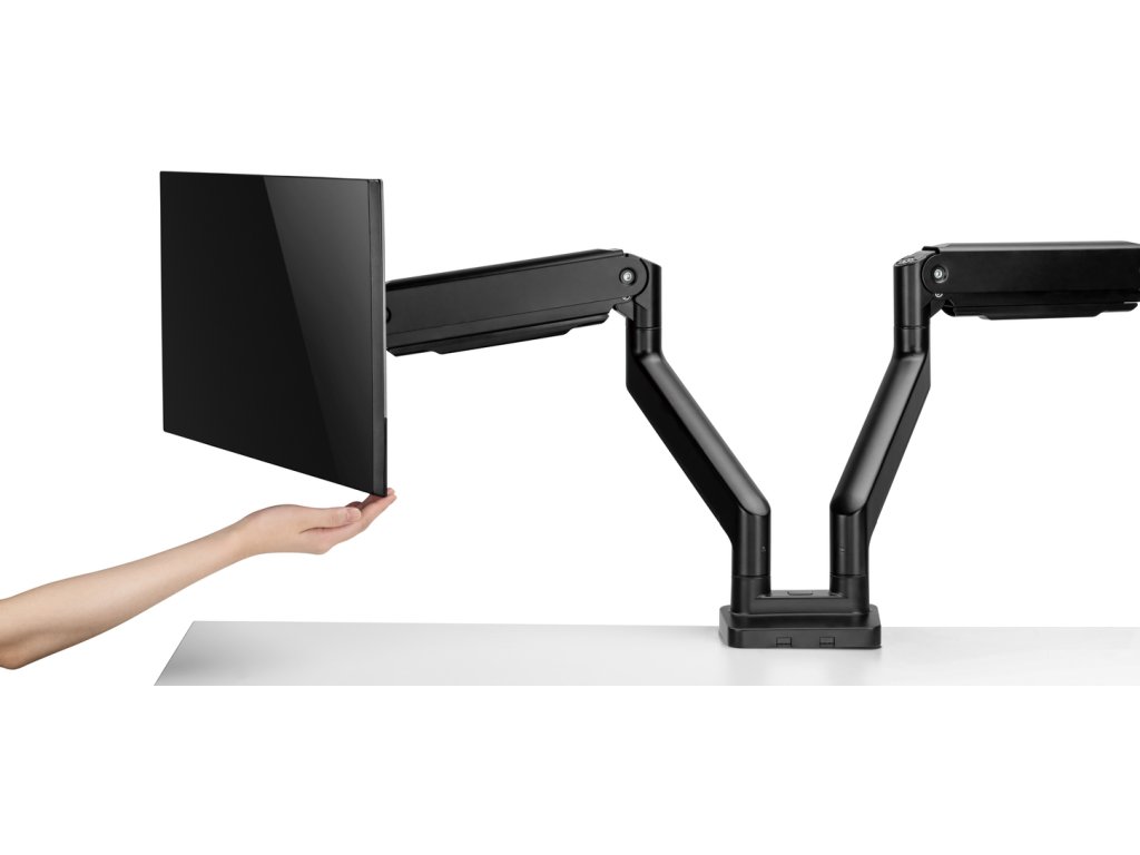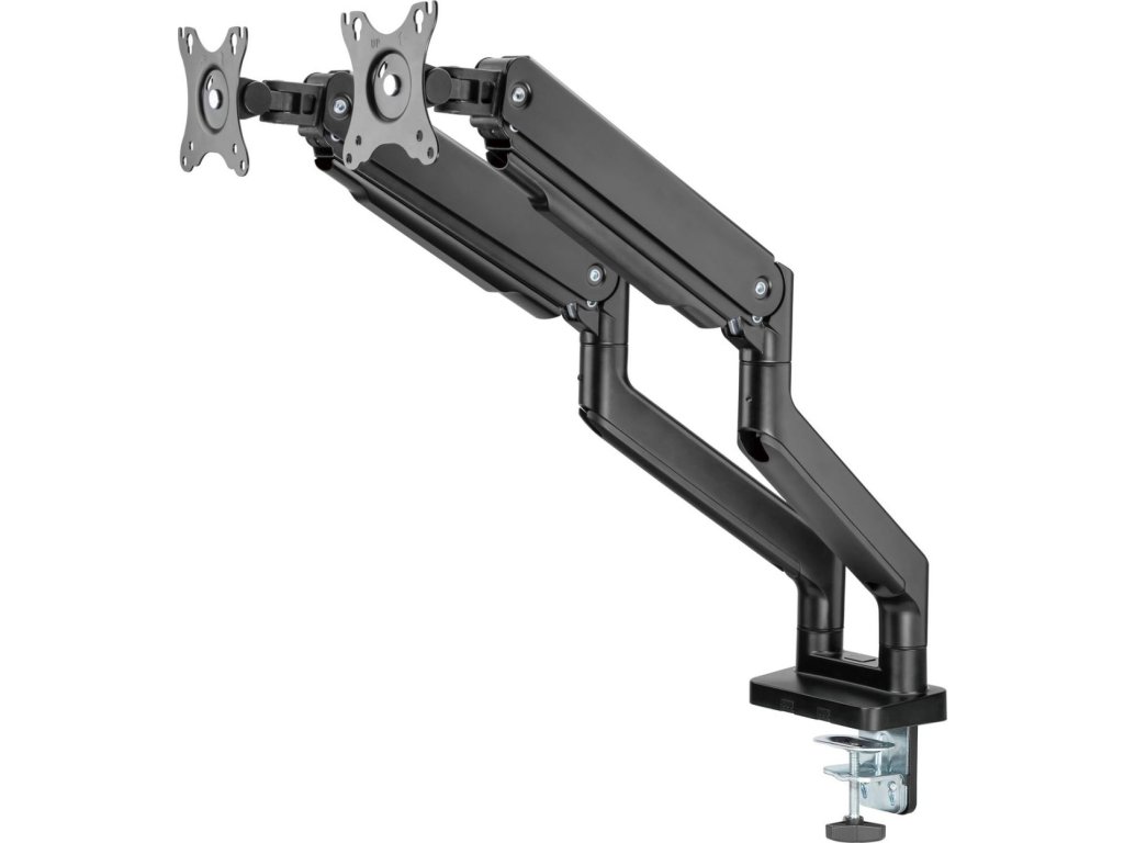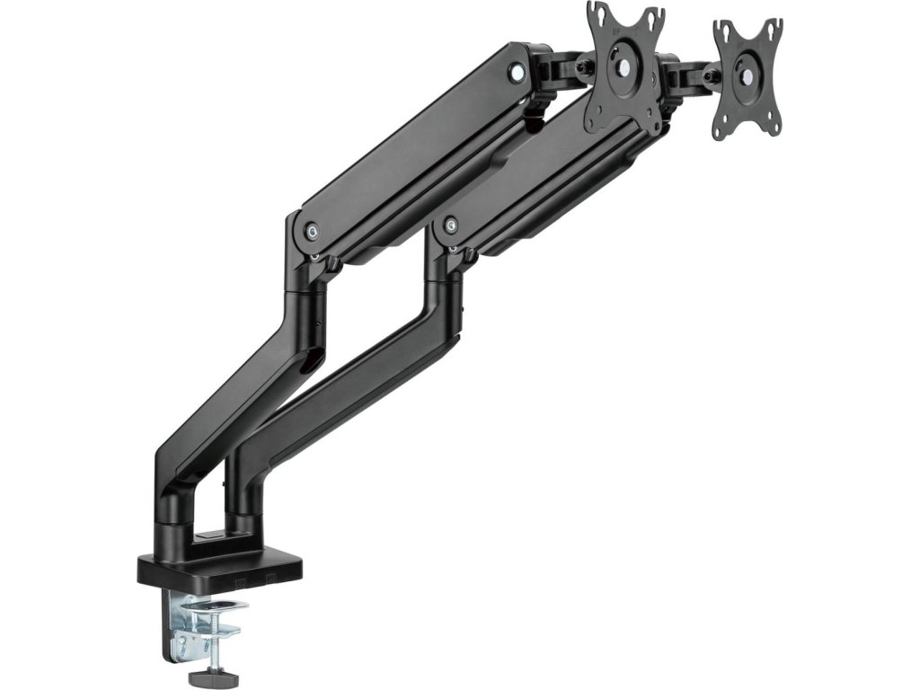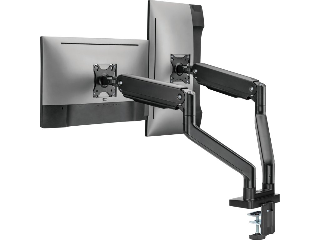 Díky odolné ocelové konstrukci poskytuje stabilní podporu pro dva monitory s úhlopříčkami 17" až 35" a hmotností až 16 kg. Flexibilní konstrukce pro dostatečné nastavení výšky a pozorovacích úhlů s možností nastavení orientace monitoru na výšku nebo na šířku. Součástí balení jsou průchodky a svorky pro instalaci na téměř jakoukoliv pracovní plochu. Odnímatelná deska VESA pro uživatelsky přívětivou instalaci.