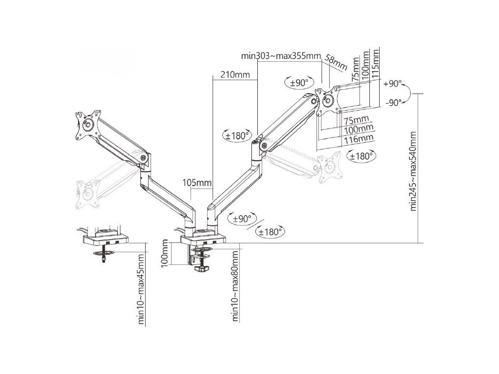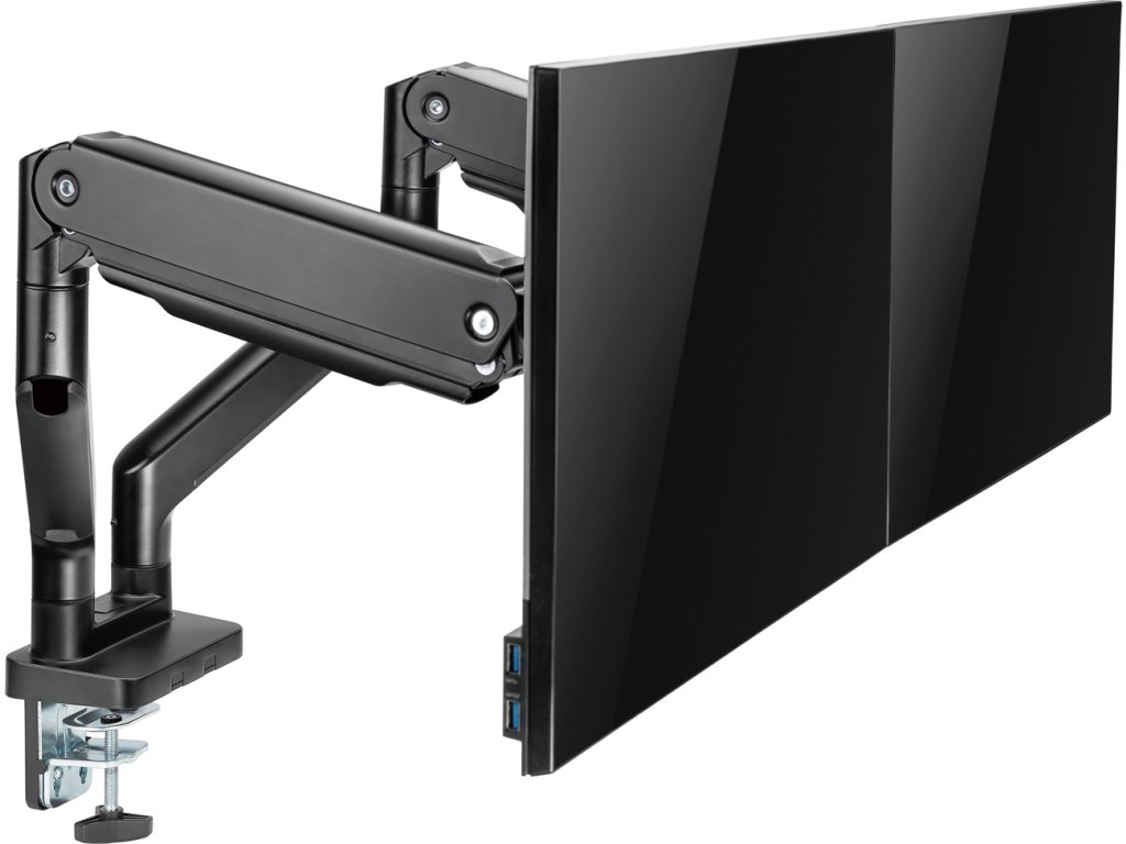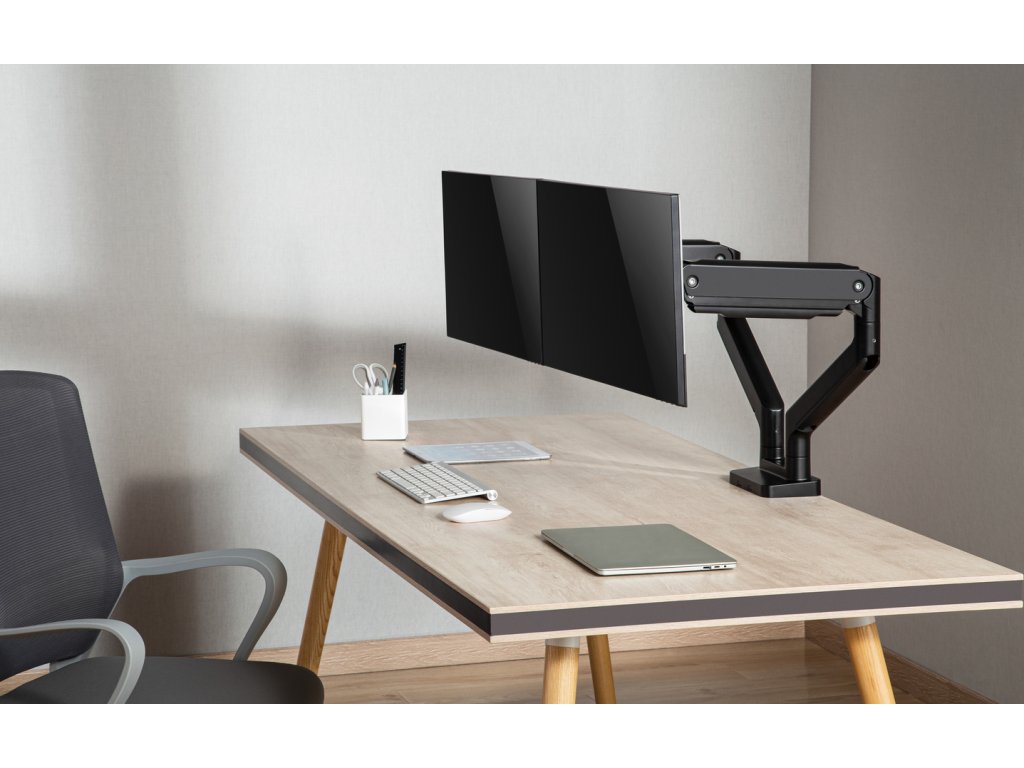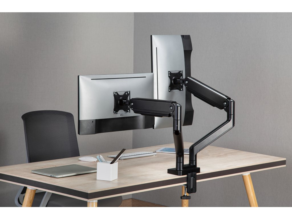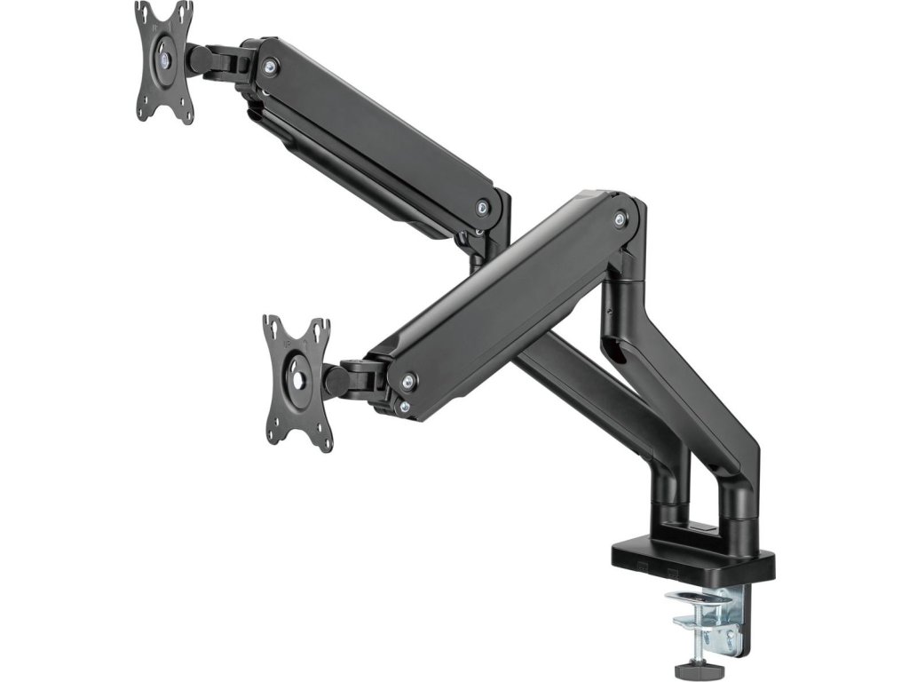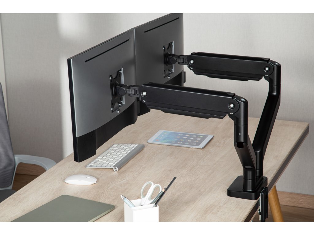 Díky odolné ocelové konstrukci poskytuje stabilní podporu pro dva monitory s úhlopříčkami 17" až 35" a hmotností až 16 kg. Flexibilní konstrukce pro dostatečné nastavení výšky a pozorovacích úhlů s možností nastavení orientace monitoru na výšku nebo na šířku. Součástí balení jsou průchodky a svorky pro instalaci na téměř jakoukoliv pracovní plochu. Odnímatelná deska VESA pro uživatelsky přívětivou instalaci.