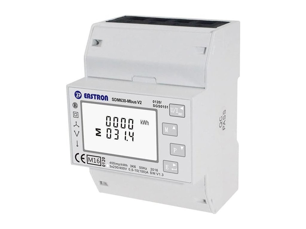 Měřiče Eastron SDM630 Modbus V2 s podsvíceným displejem jsou pokročilá multifunkční zařízení určená pro obousměrné měření elektrické energie v jednofázových i třífázových instalacích. Kromě obousměrného toku energie (export a import) umožňují měřiče SDM630 Modbus V2 také registraci a čtení mnoha dalších parametrů sítě. Měřič má konektor RS-485, takže naměřené hodnoty lze snadno odečítat pomocí protokolu Modbus-RTU. Navíc má dva pulzní výstupy, včetně jednoho přizpůsobitelného.