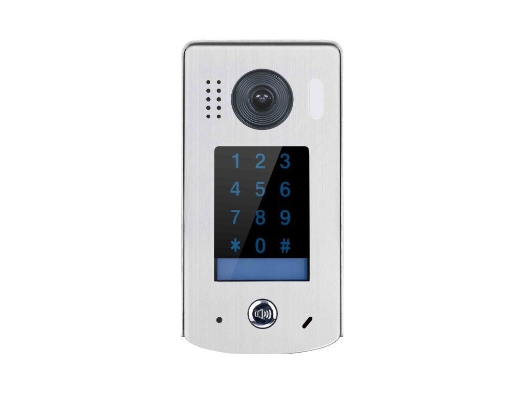Dverná kamerová jednotka farebná s jedným tlačidlom a dotykovou kódovou klávesnicou, podsvietená menovka a klávesnica, prevedenie kov, prisvetlenie snímaného priestoru, širokouhlá kamera 170°, IP 43, 12 V DC alebo relé ovládanie pre 1 zámok, rozmery 90 x 180 x 36 mm, so strieškou, montáž na omietku, napájanie 24 V DC zo zbernice systému, dvojvodičový systém zapojenia - nepolarizovaný, odporúčaný netienený krútený pár, min. 2x 1 mm