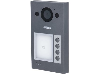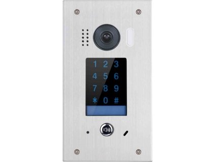 Dverná kamerová jednotka farebná so štyrmi tlačidlami a 125 kHz RFID čítačkou, kapacita 320 kariet, podsvietená menovka a LED indikácia, prevedenie kov, prisvetlenie snímaného priestoru, širokouhlá kamera 170°, IP 54, 12 V DC alebo relé ovládanie pre 1 zámok, pridávanie/odoberanie kariet cez master karty, rozmery 179 x 94 x 42 mm, so strieškou, napájanie 24 V DC zo zbernice systému, montáž na omietku, dvojvodičový systém zapojenia – nepolarizovaný, odporúčaný netienený krútený pár, min. 2x 1 mm