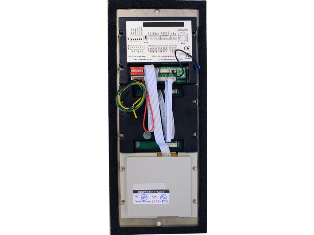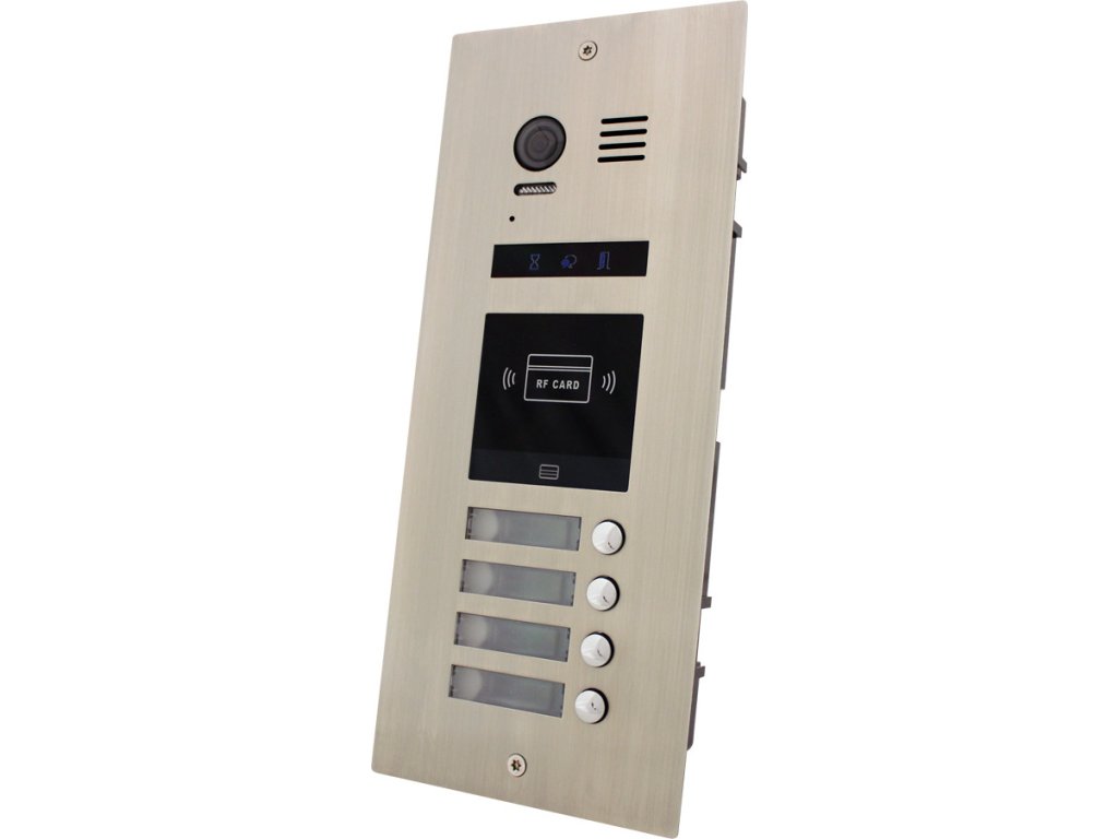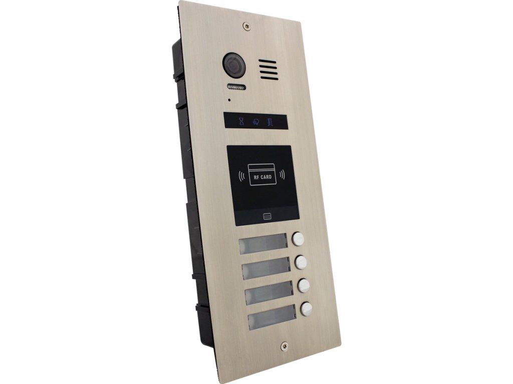 Dverná jednotka, video, 4 tlačidlá, antivandal, podsvietené menovky, indikácia stavu hovoru, prevedenie antikor, biele LED prisvetlenie snímaného priestoru, farebná kamera, uhol záberu 105°, krytie IP 43, 12 V DC alebo NO/NC relé ovládanie pre 1 zámok, (možnosť pridať RLC modul pre 2. zámok), nastaviteľná dĺžka otvorenia 1–99 s, zabudovaná RFID čítačka kariet 125 kHz (kapacita 300 užívateľov, možnosť priradenia a editácie kľúčenky ku konkrétnemu bytu), možná záloha prístupových kariet a čipov, rozmery 133 x 316 x 52 mm, montáž pod omietku, inšt. krabica súčasťou, napájanie 24 V DC zo zbernice systému, dvojvodičový systém zapojenia - nepolarizovaný, odporúčaný netienený krútený pár, min. 2 x 1 mm, pre správnu funkčnosť systému je potrebné použiť napájací zdroj LRS-100-24