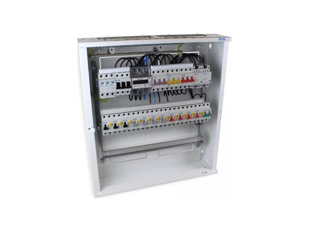 Modulová rozvodná skříň Eaton nabízí kapacitu 72 modulů ve třech řadách a je ideální pro domovní i komerční instalace do 160 A. Díky hloubce 140 mm poskytuje dostatek prostoru pro vedení kabelů a montáž přístrojů. Konstrukce z ocelového plechu s krytím IP30 a třídou ochrany I zajišťuje odolnost a bezpečnost. Nástěnná montáž na omítku umožňuje snadnou instalaci a flexibilní využití. Skříň je dodávána včetně dveří, DIN rámu, svorkovnic a průchodek, připravena k okamžitému použití.