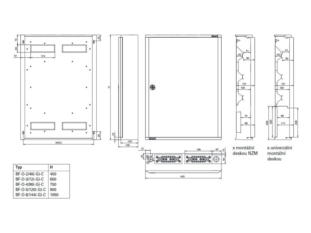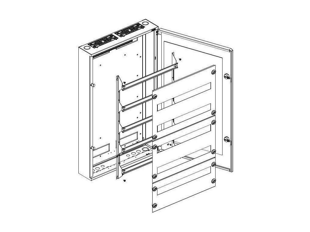 - Součástí balení jsou: skříň, dveře, montážní rám s přístrojovými lištami, svorkovnice N a PE, kabelové průchodky.
