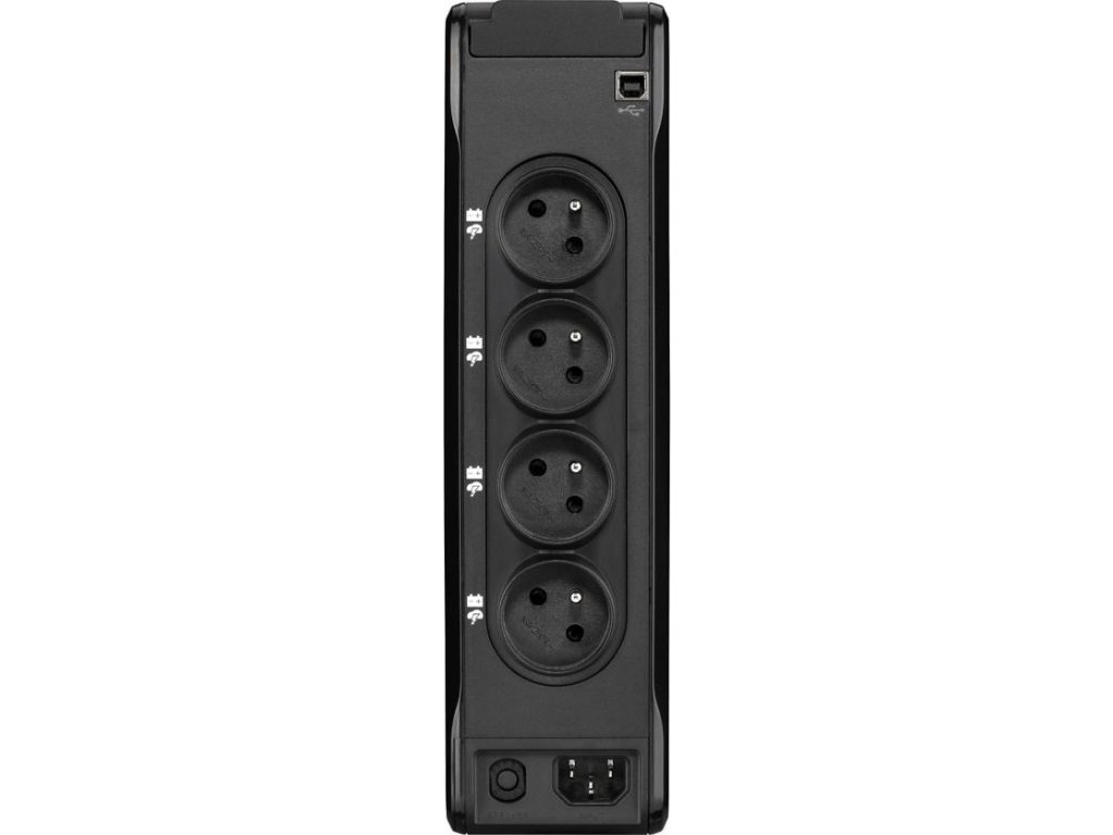 Zdroj je vybaven 4 zásuvkami s ochranou proti přepětí a záložním napájením a 4 zásuvkami pouze s ochranou proti přepětí ve francouzském standardu (FR). Díky elegantnímu a kompaktnímu designu se zdroj hodí do jakéhokoliv prostředí - můžete jej umístit horizontálně, vertikálně nebo s volitelným příslušenstvím i na stěnu či do racku.