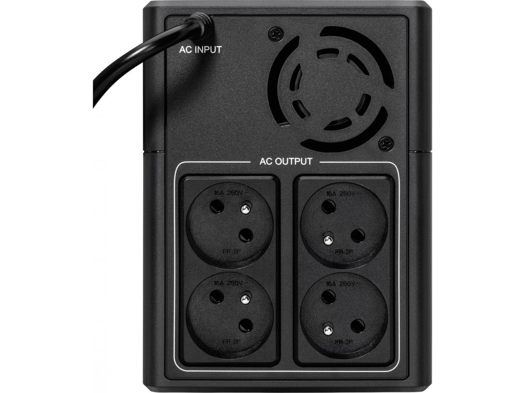 - Technologie automatické regulace napětí (AVR) s dvojitým posílením reguluje kolísání sítě (podpětí a přepětí), aby šetřila energii z baterií při případě výpadku napájení.