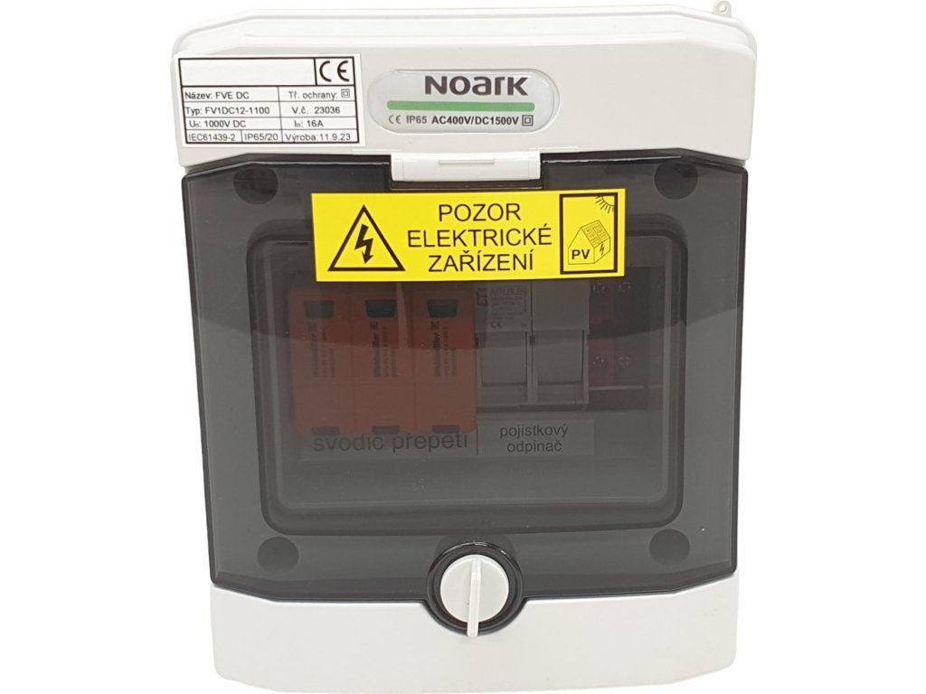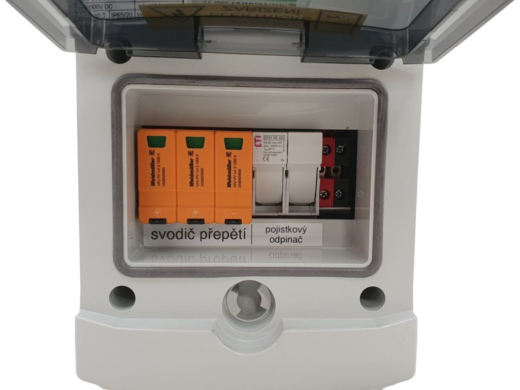 Kompletní nástěnná rozvodnice určená pro povrchovou montáž a instalaci 1 stringu včetně certifikovace pro využití v rámci fotovoltaického systému. Je vybavena 1 svodičem přepětí T1+T2, 1 pojistkovým odpojovačem a 2 pojistkami (10 x 38 gPV 16A/1000V). Stupeň ochrany IP65 znamená, že rozvodnice při správné montáži zcela odolá prachu a tryskající vodě ze všech úhlů.