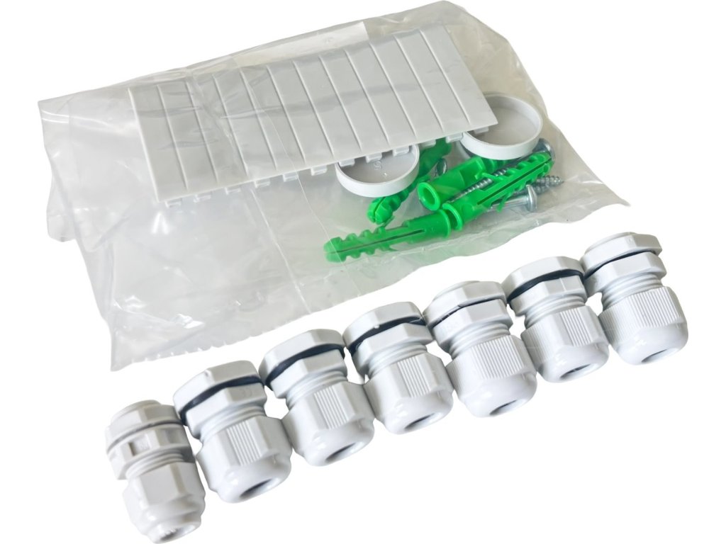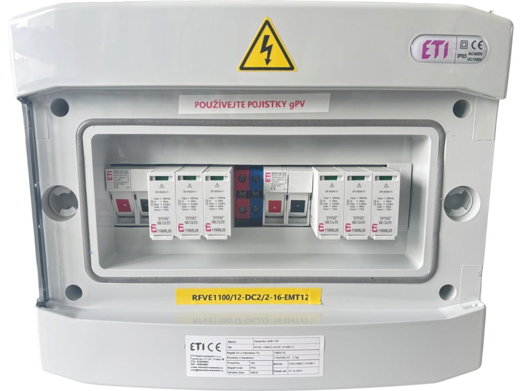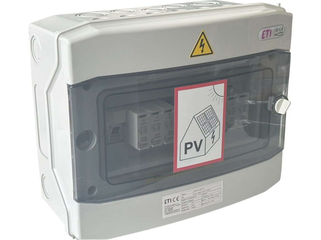 Kompletní nástěnná rozvodnice třídy 1+2, maximální napětí 1000 V určená pro povrchovou montáž a instalaci 2 stringů včetně certifikovace pro využití v rámci fotovoltaického systému. Je vybavena 2 svodiči přepětí T1+T2, 2 pojistkovými odpojovači a celkově 4 pojistkami (10 x 38 gPV 16A/1000V). Stupeň ochrany IP65 znamená, že rozvodnice při správné montáži zcela odolá prachu a tryskající vodě ze všech úhlů.