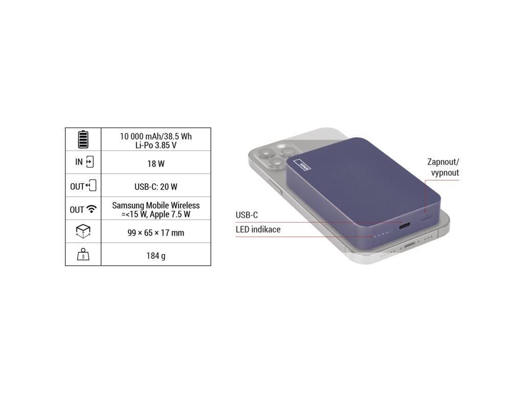 EMOS POWERBANKA WI 1046, bezdrátové nabíjení 20W, 10.000mAh, MODRÁ, 1xUSB-C